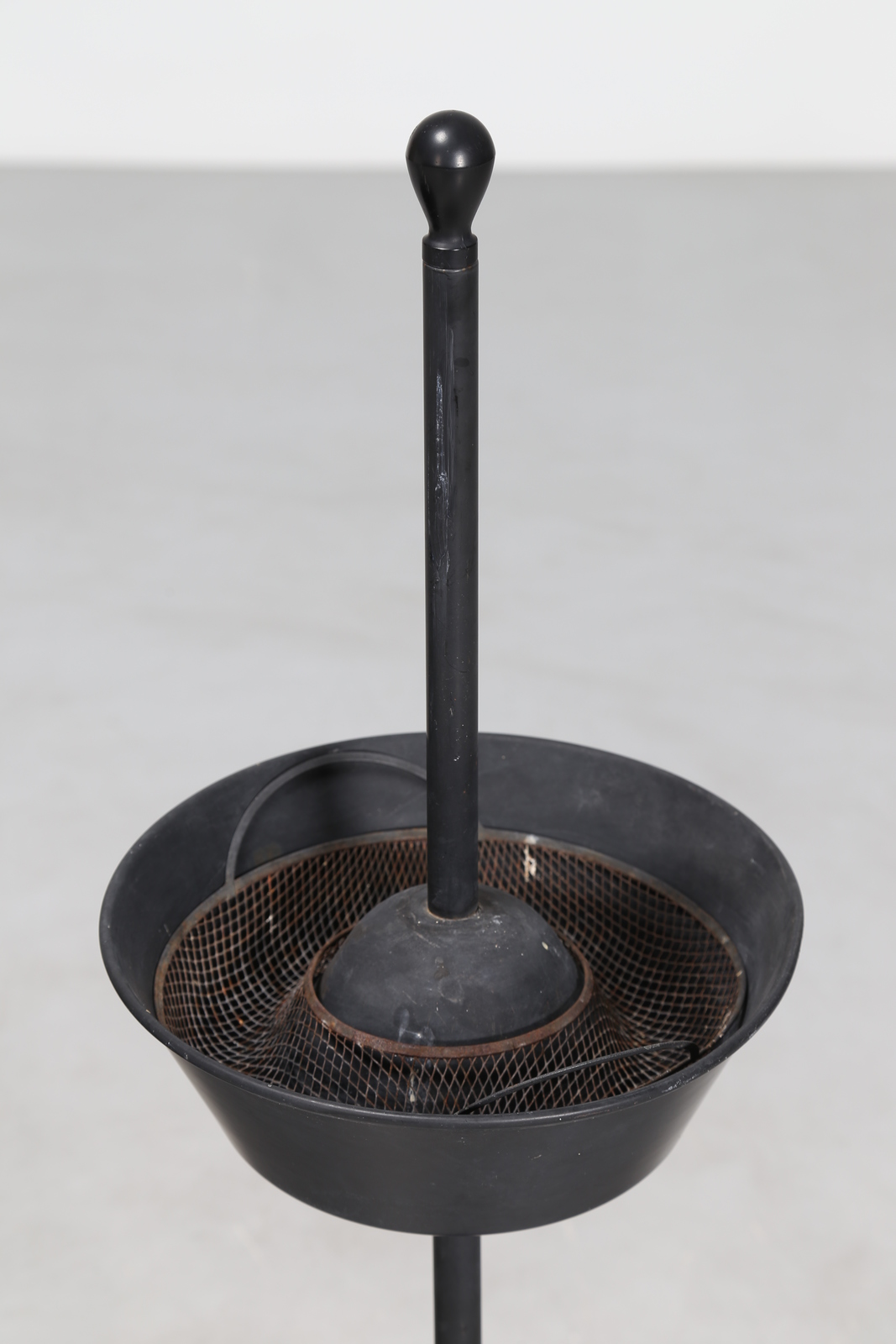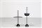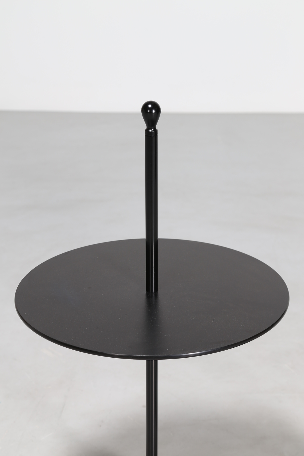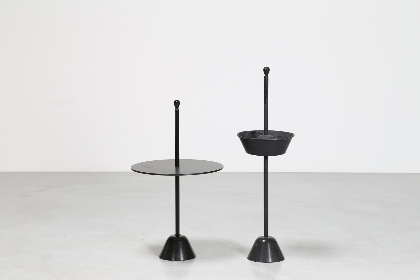 CASTIGLIONI ACHILLE E PIERGIACOMO Tavolino di servizio con base in polipropilene e asta in acciaio verniciato, colore nero o bianco, 1974. Posacenere con base in polipropilene, vaschetta in alluminio e struttura di sostegno1 in acciaio verniciato, 1961. Produzione Zanotta. . -. Cm 50,00 x 90,00. Posacenere misura: 106 x 32 Tavolino misura: 90 x 50