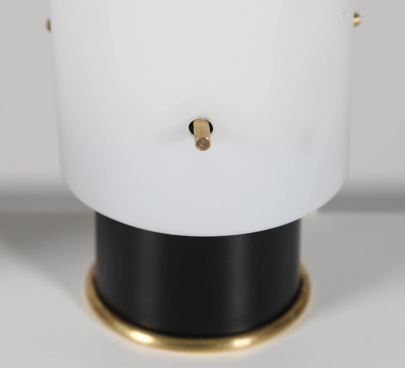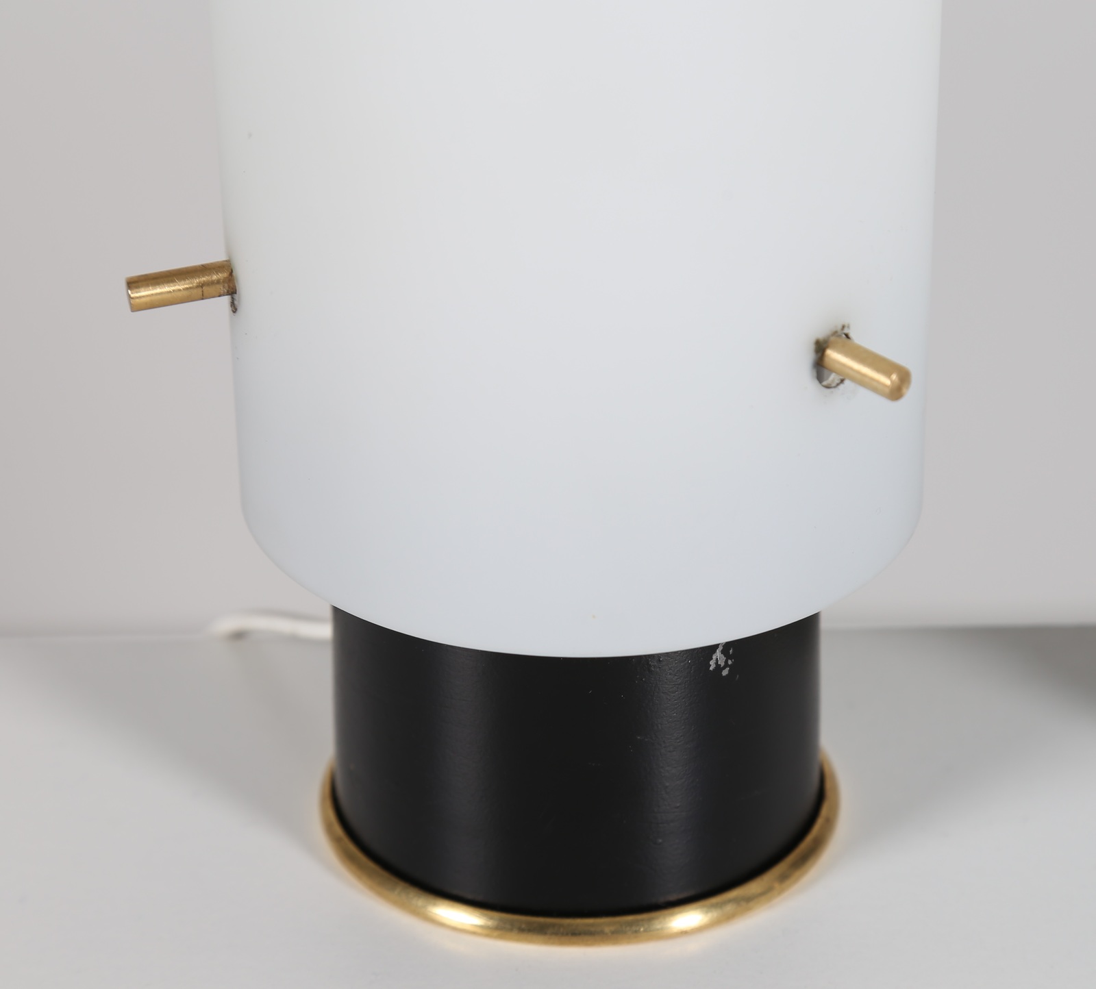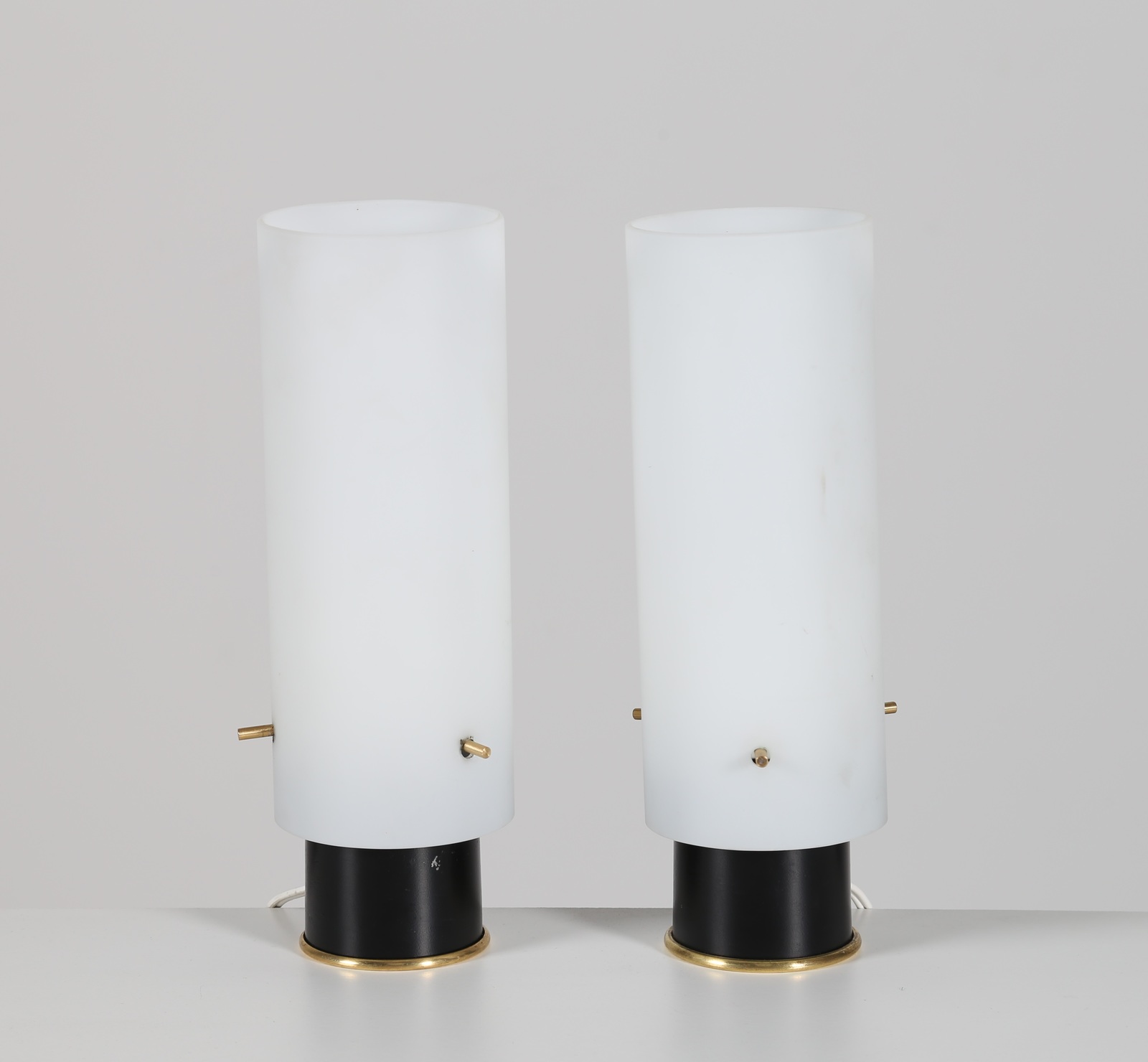ARREDOLUCE Attrib. Coppia di lampade da comodino in metallo ottone e vetro satinato, anni 50. -. Cm 9,00 x 24,50 x 9,00.