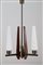 MANIFATTURA ITALIANA Coppia di lampadari in metallo laccato, ottone, legno e vetro satinato, anni 60. -. Cm 40,00 x 74,00 x 40,00.