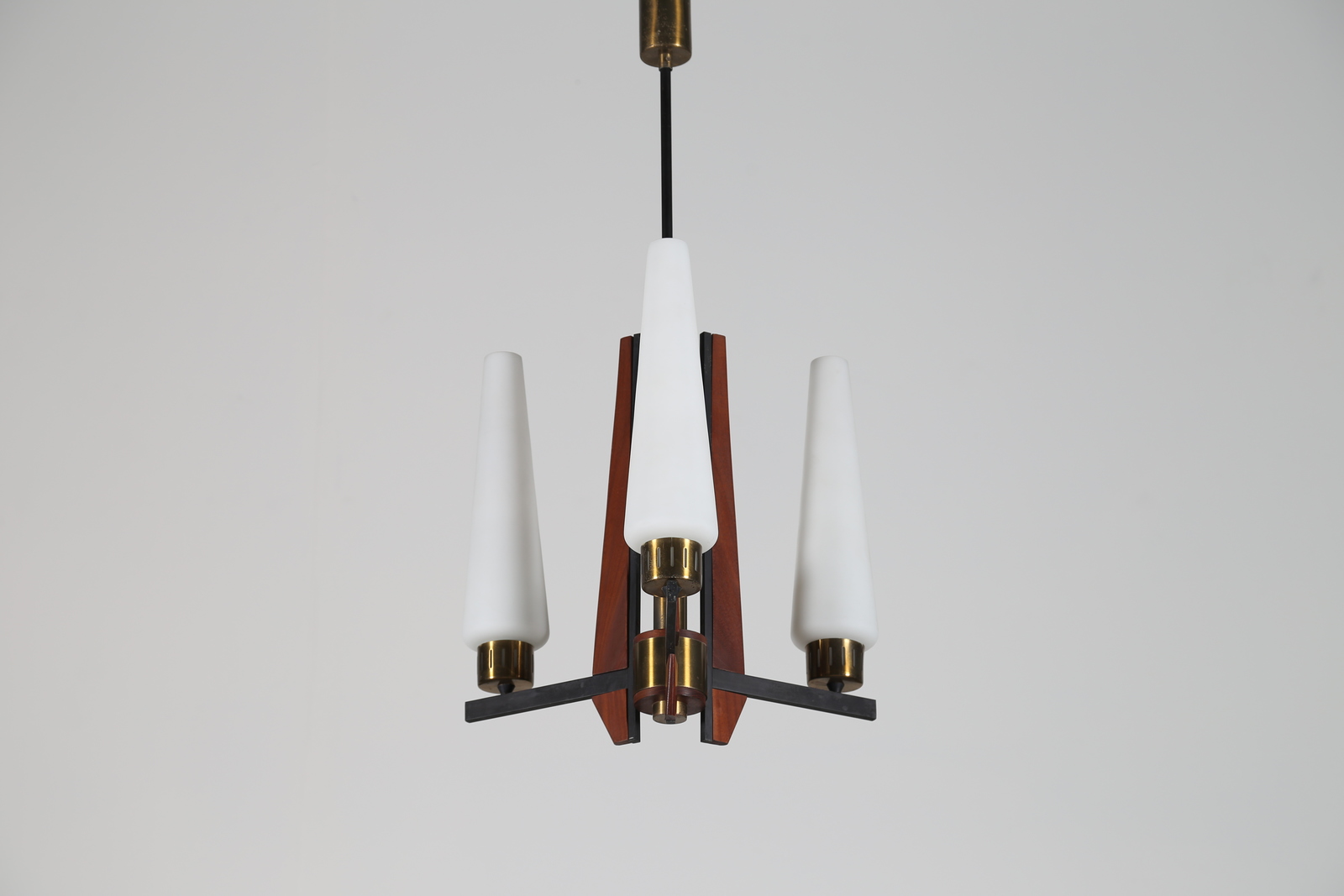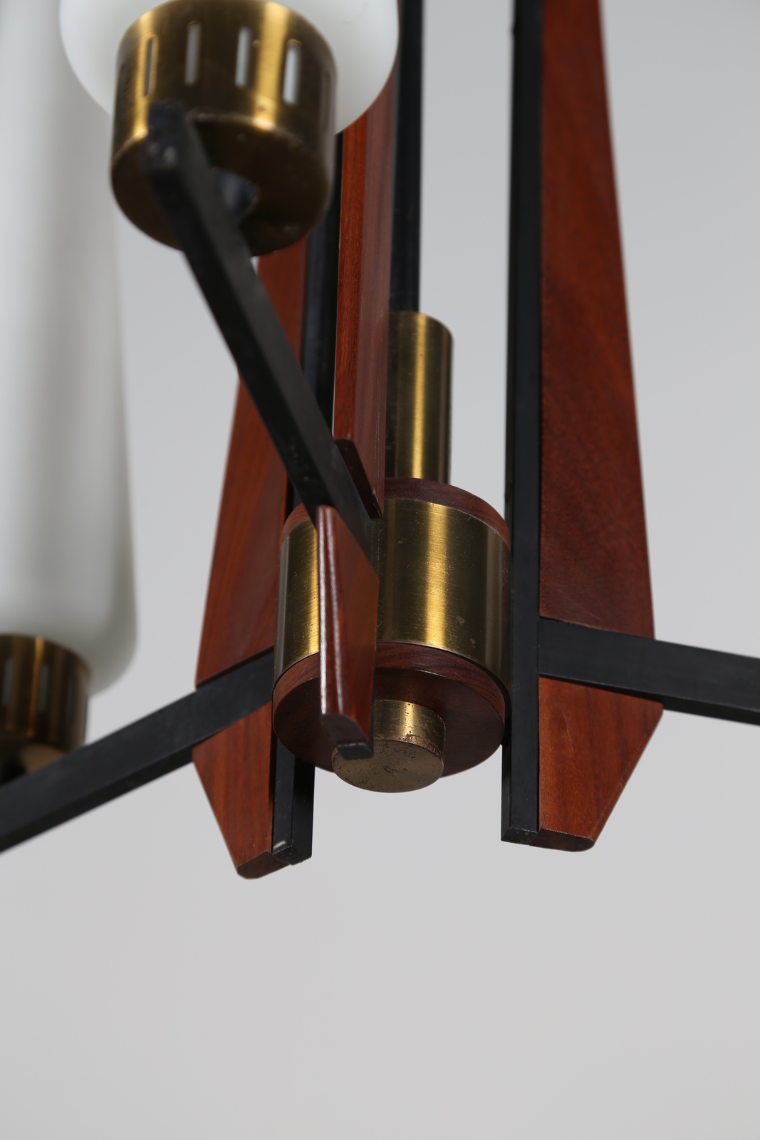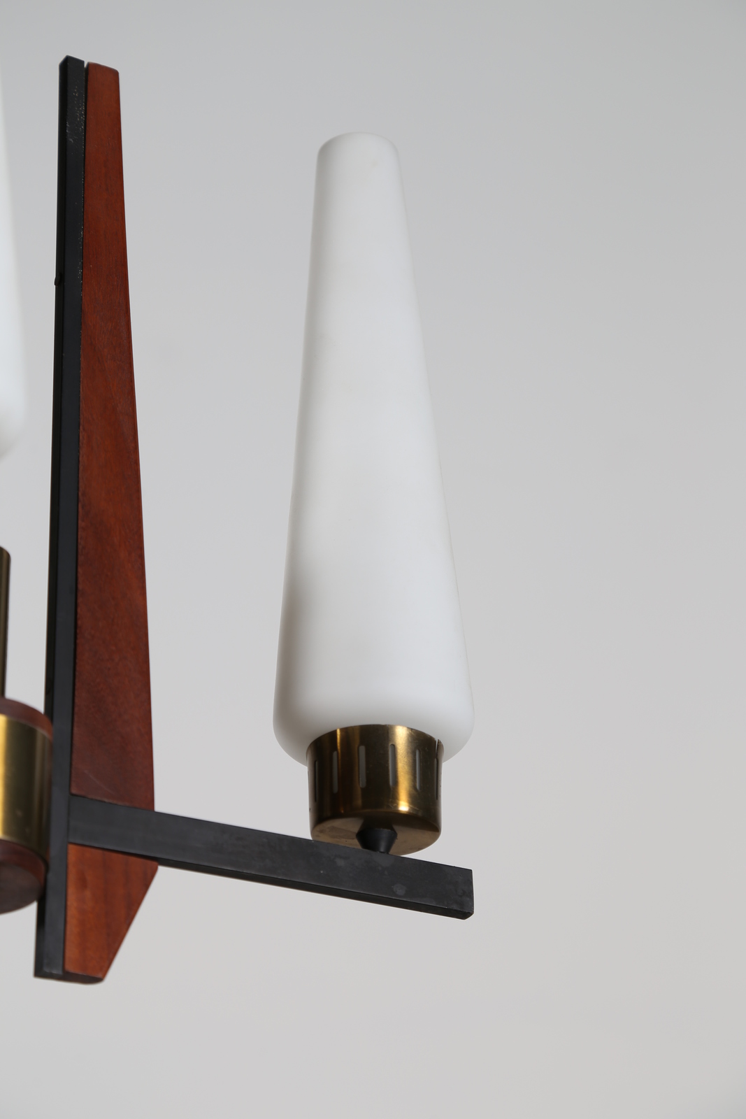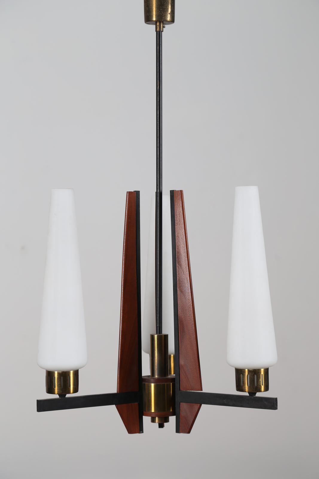 MANIFATTURA ITALIANA Coppia di lampadari in metallo laccato, ottone, legno e vetro satinato, anni 60. -. Cm 40,00 x 74,00 x 40,00.