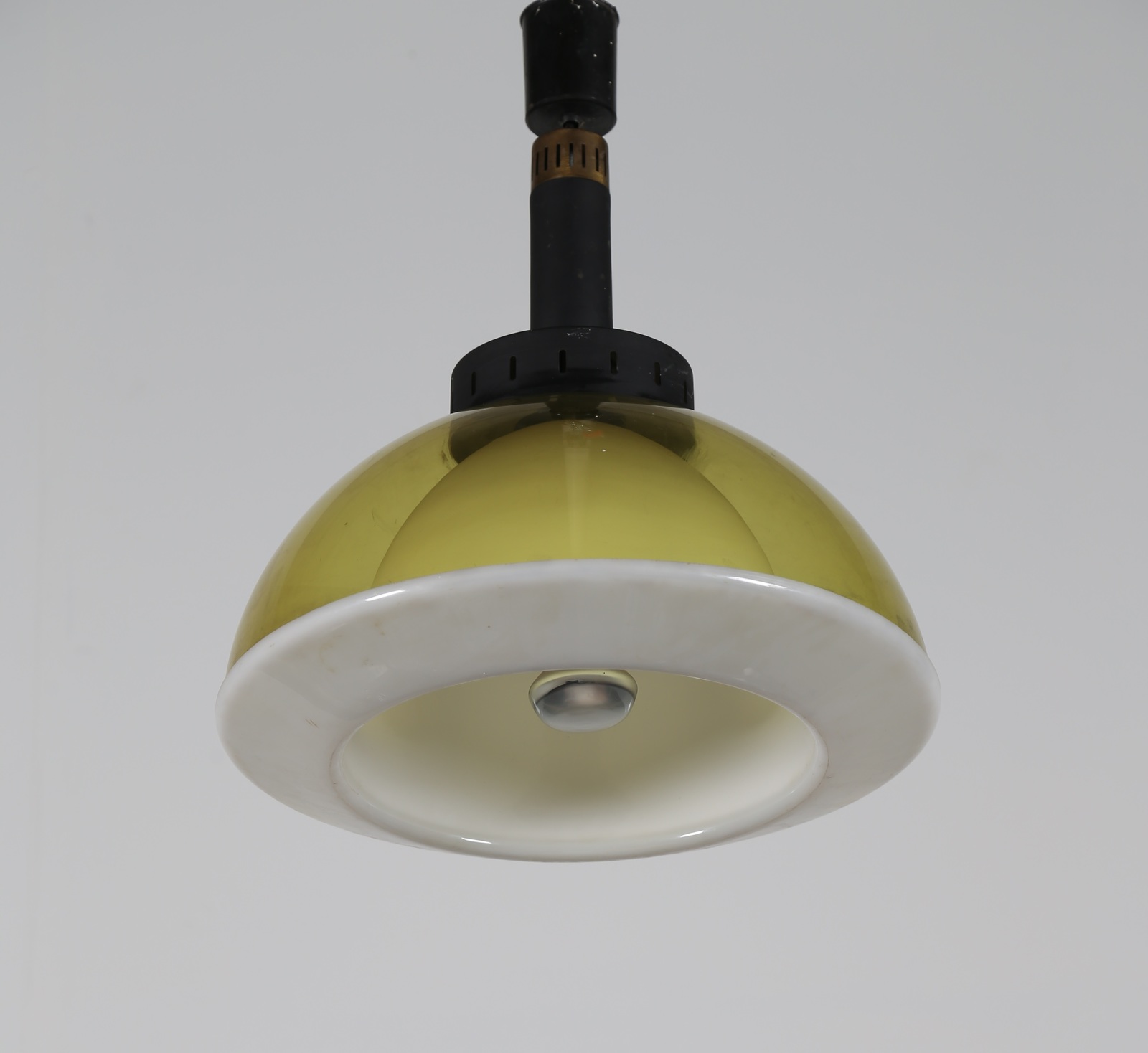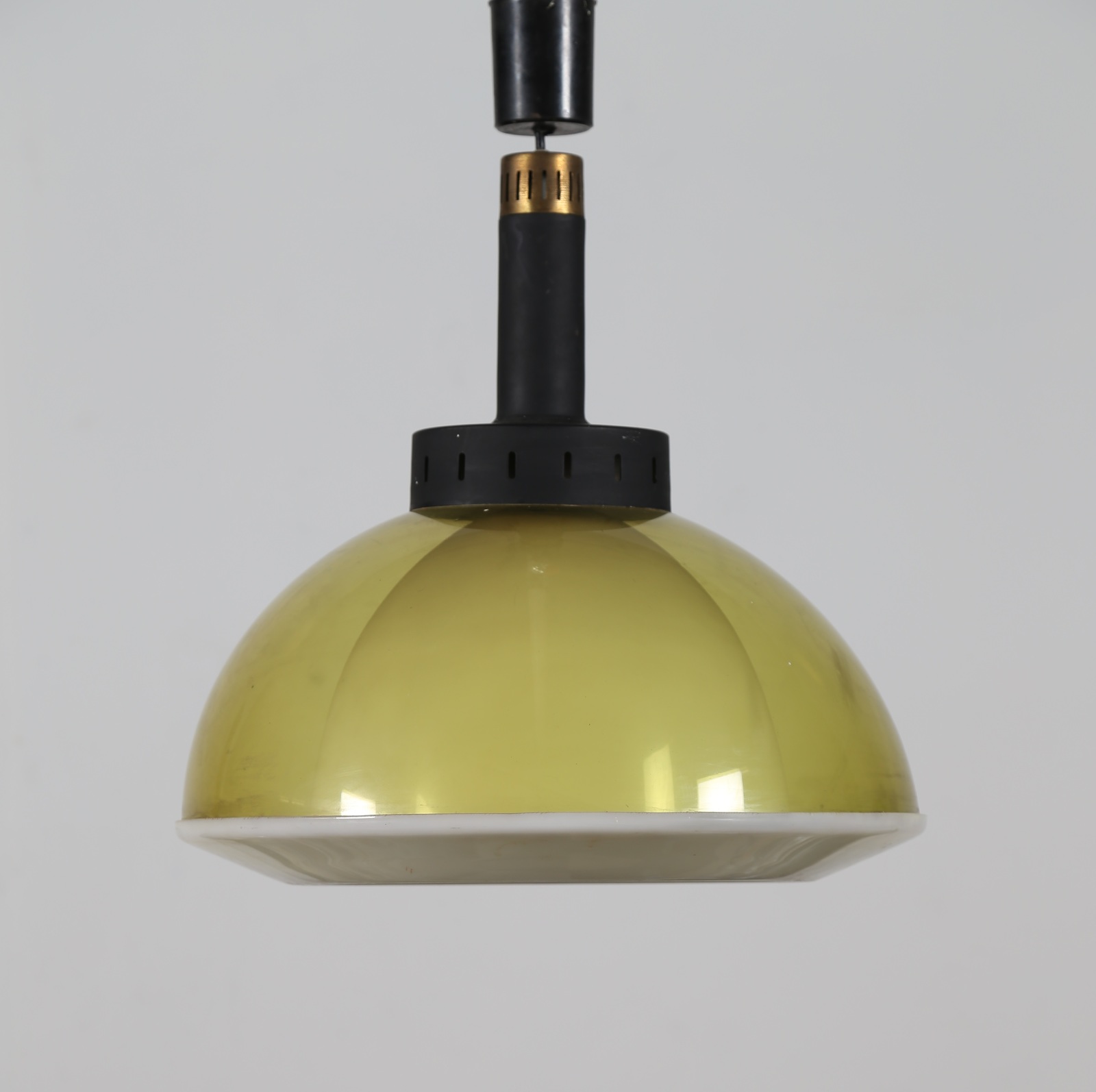 STILNOVO Coppia di lampadari in metallo laccato ottone e perspex, anni 70. -....