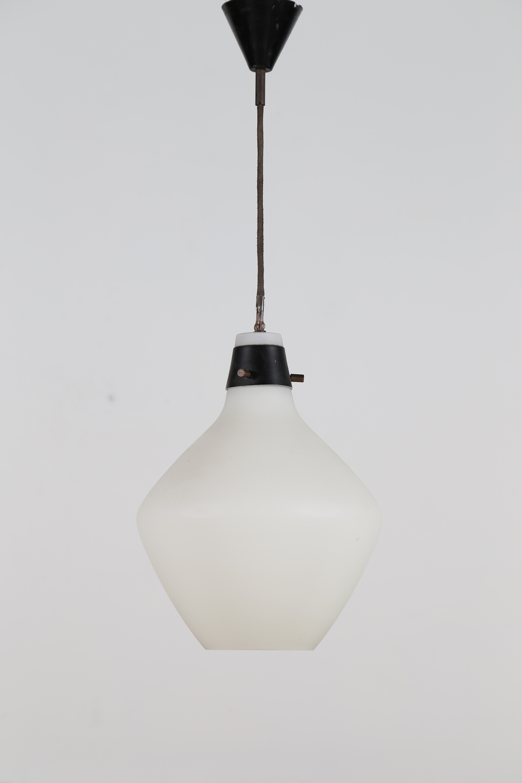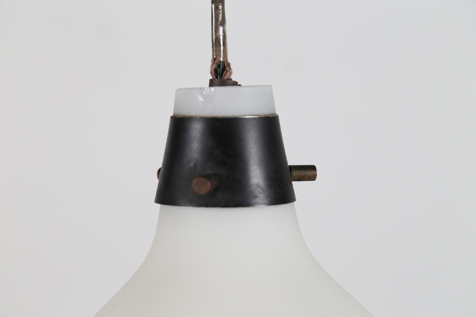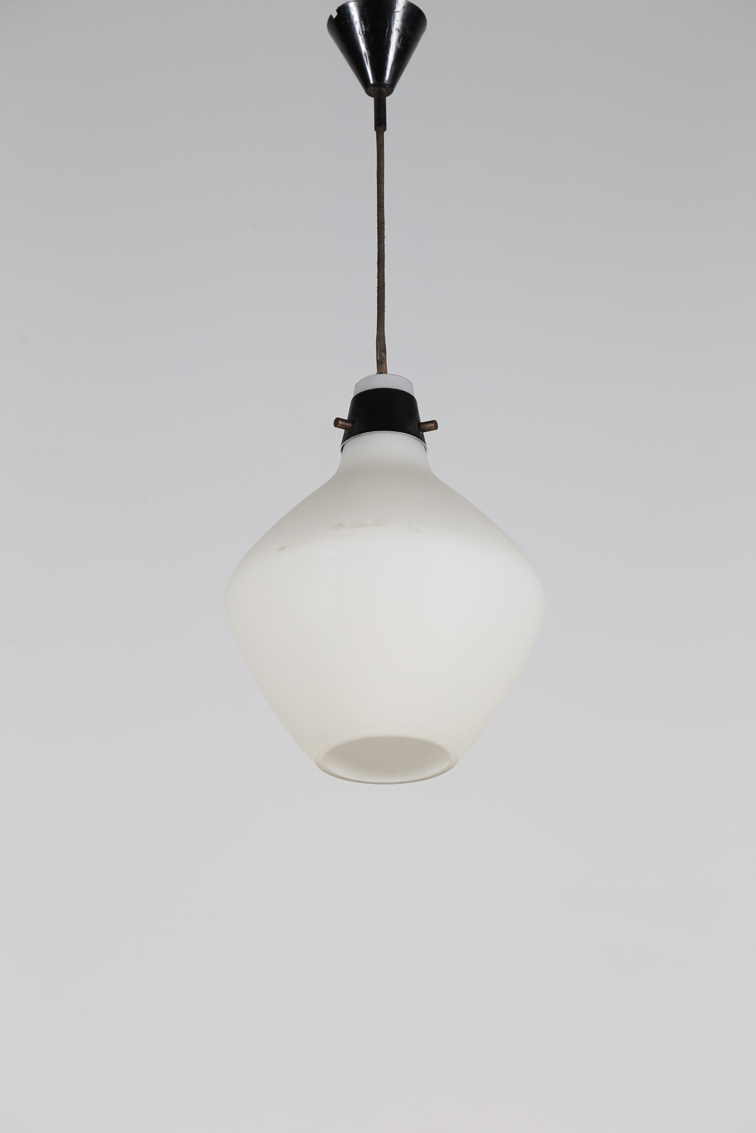 STILNOVO Coppia di lampade a sospensione in metallo laccato ottone e vetro satinato, per Stilnovo anni 60. -. Cm 24,00 x 65,00 x 24,00.