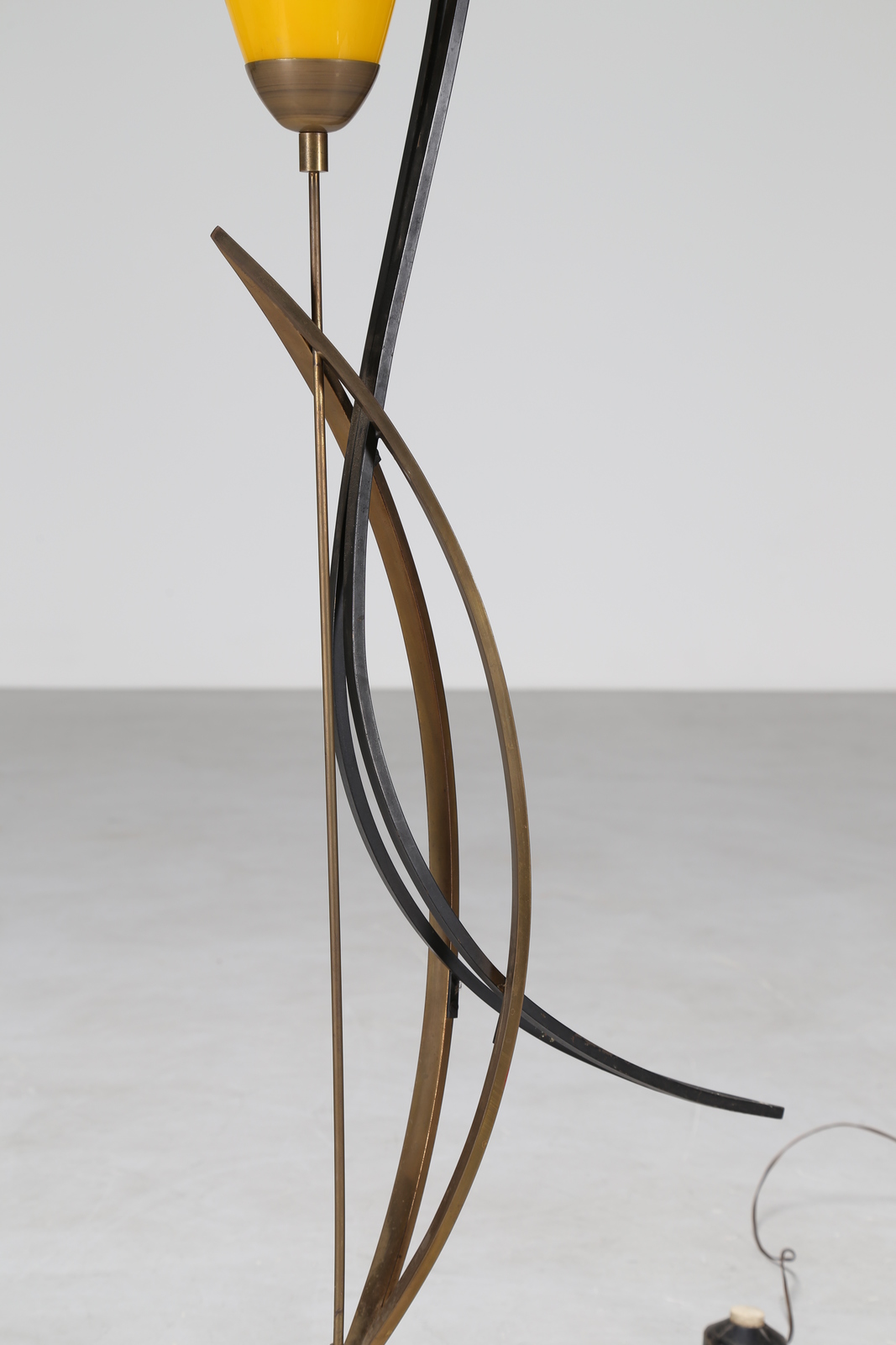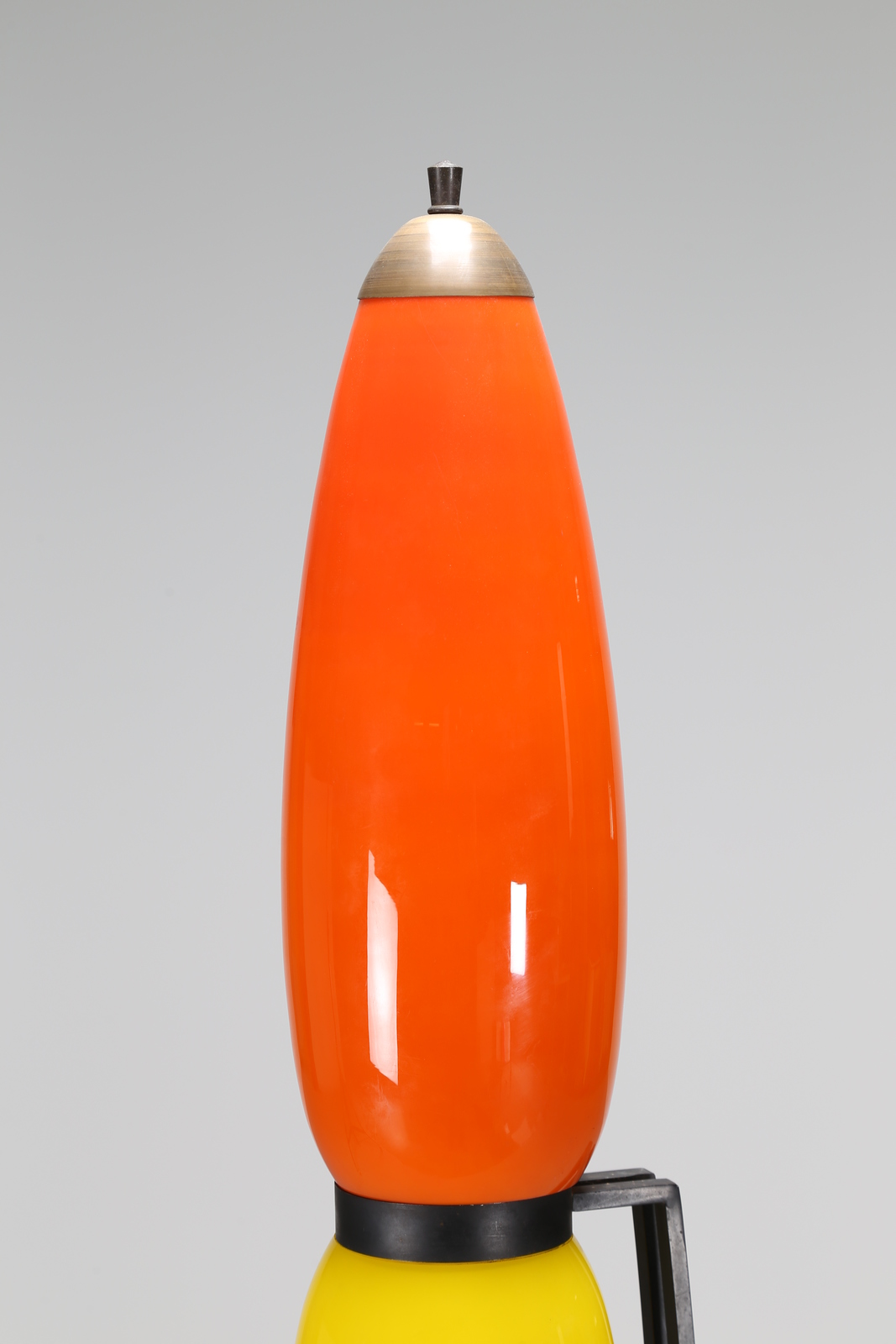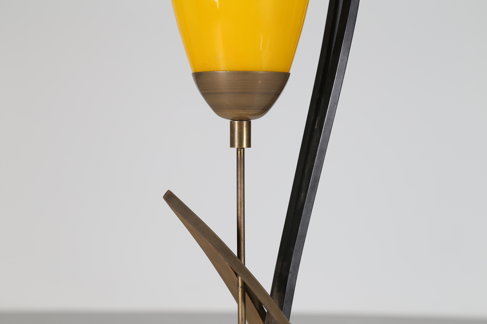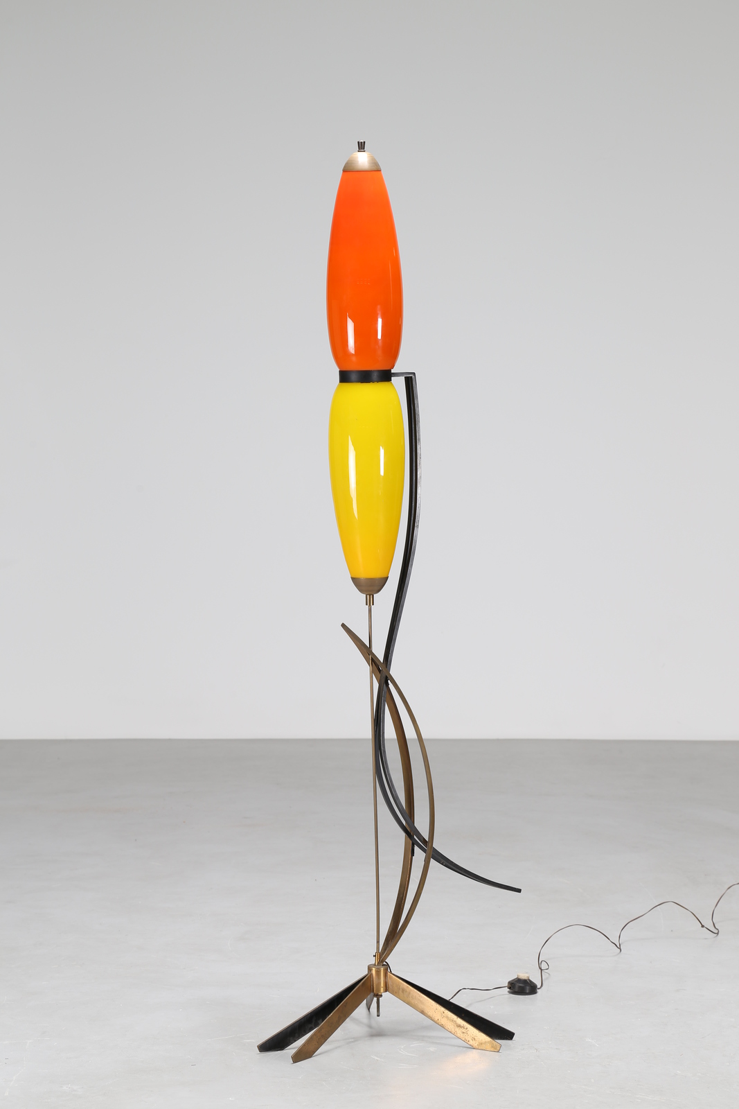 MANIFATTURA ITALIANA Lampada da terra in metallo e ottone con vetri incamiciati rosso e giallo, anni 60. -. Cm 60,00 x 170,00 x 50,00.