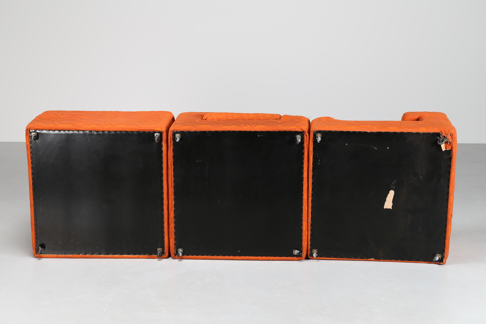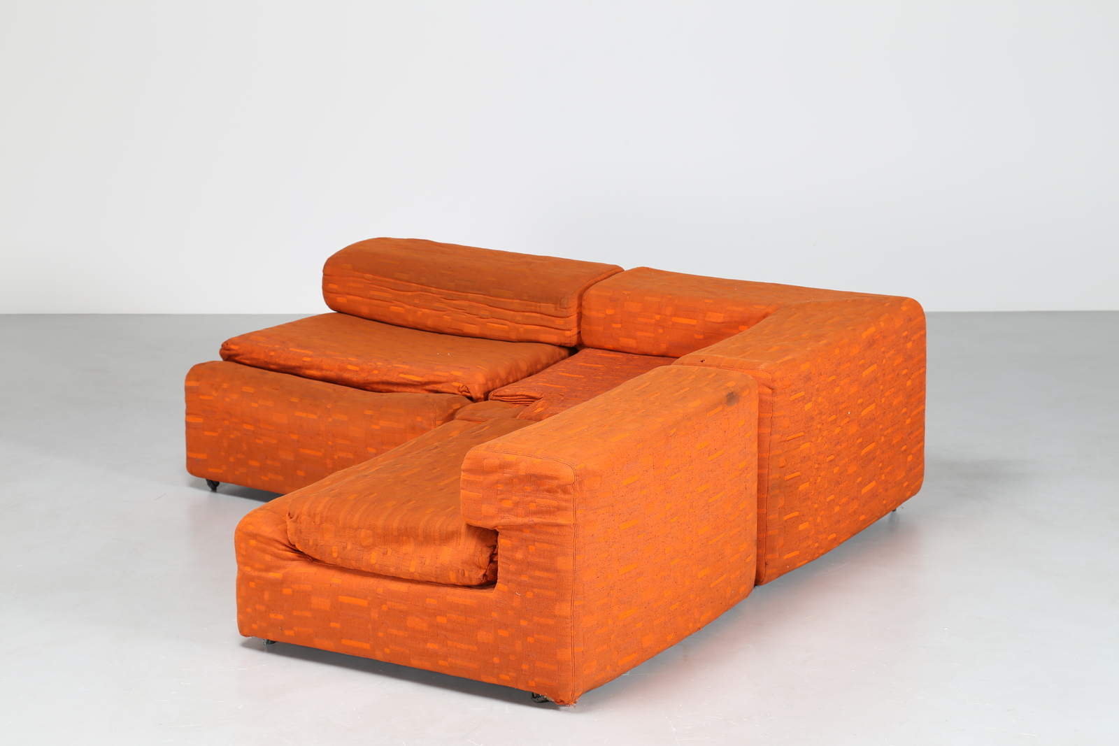 MANGIAROTTI ANGELO (n. 1921) Divano componibile a tre moduli in tessuto originale, facente parte di casa Vitale in Milano, interamente disegnata e arredata da Angelo Mangiarotti negli anni 60 e realizzati in pezzi unici. Tessuto e legno. Cm 170,00 x 55,00 x 170,00.