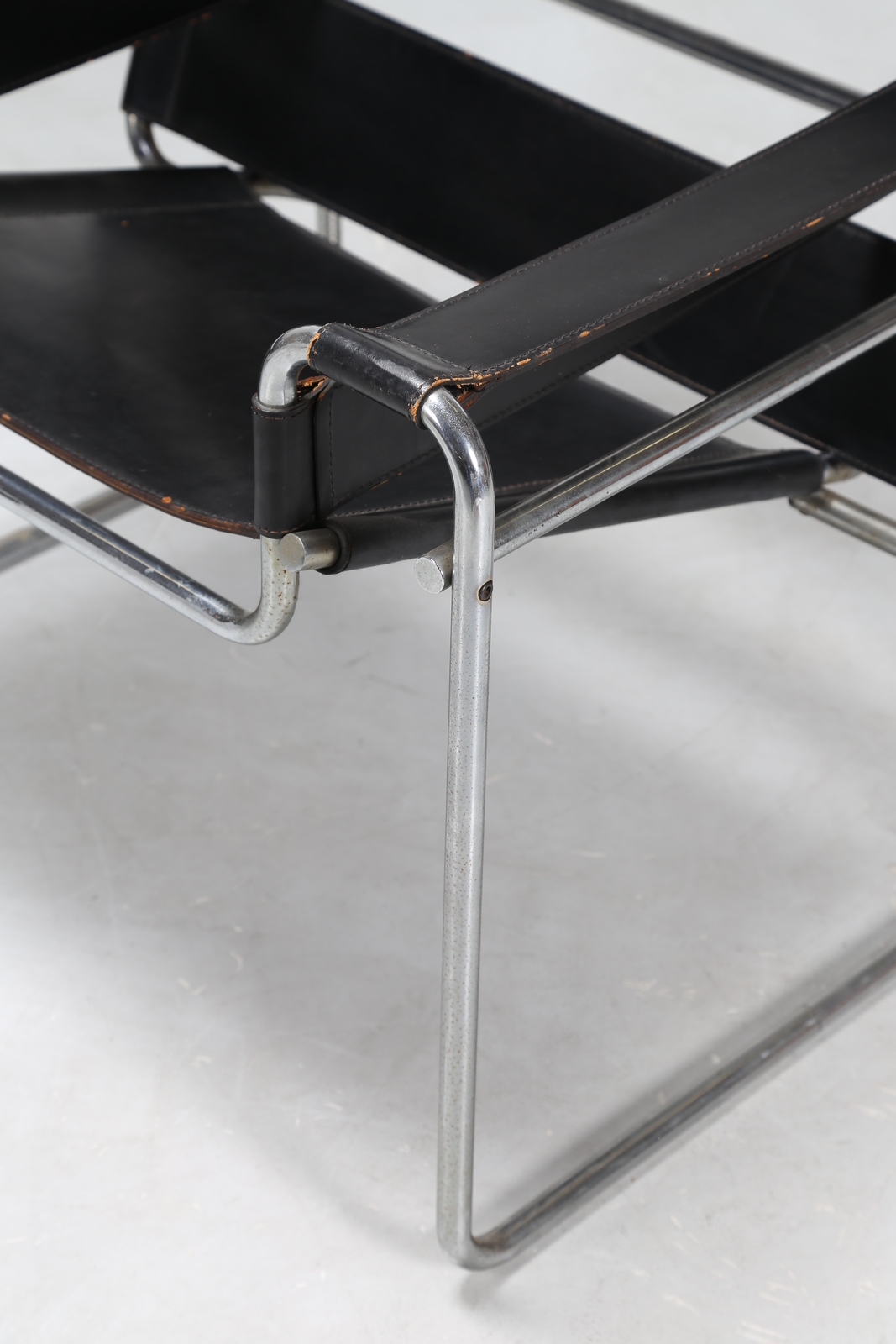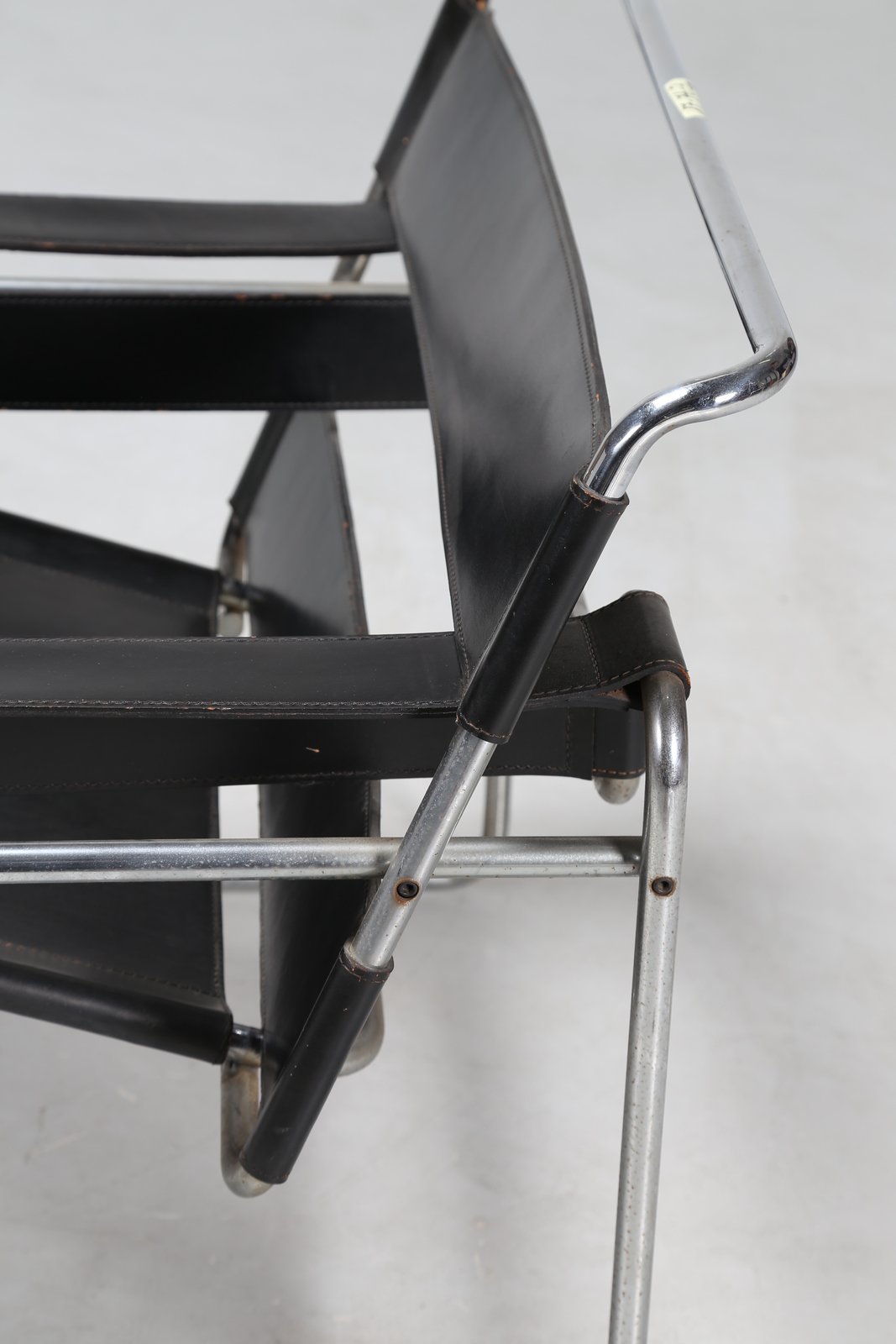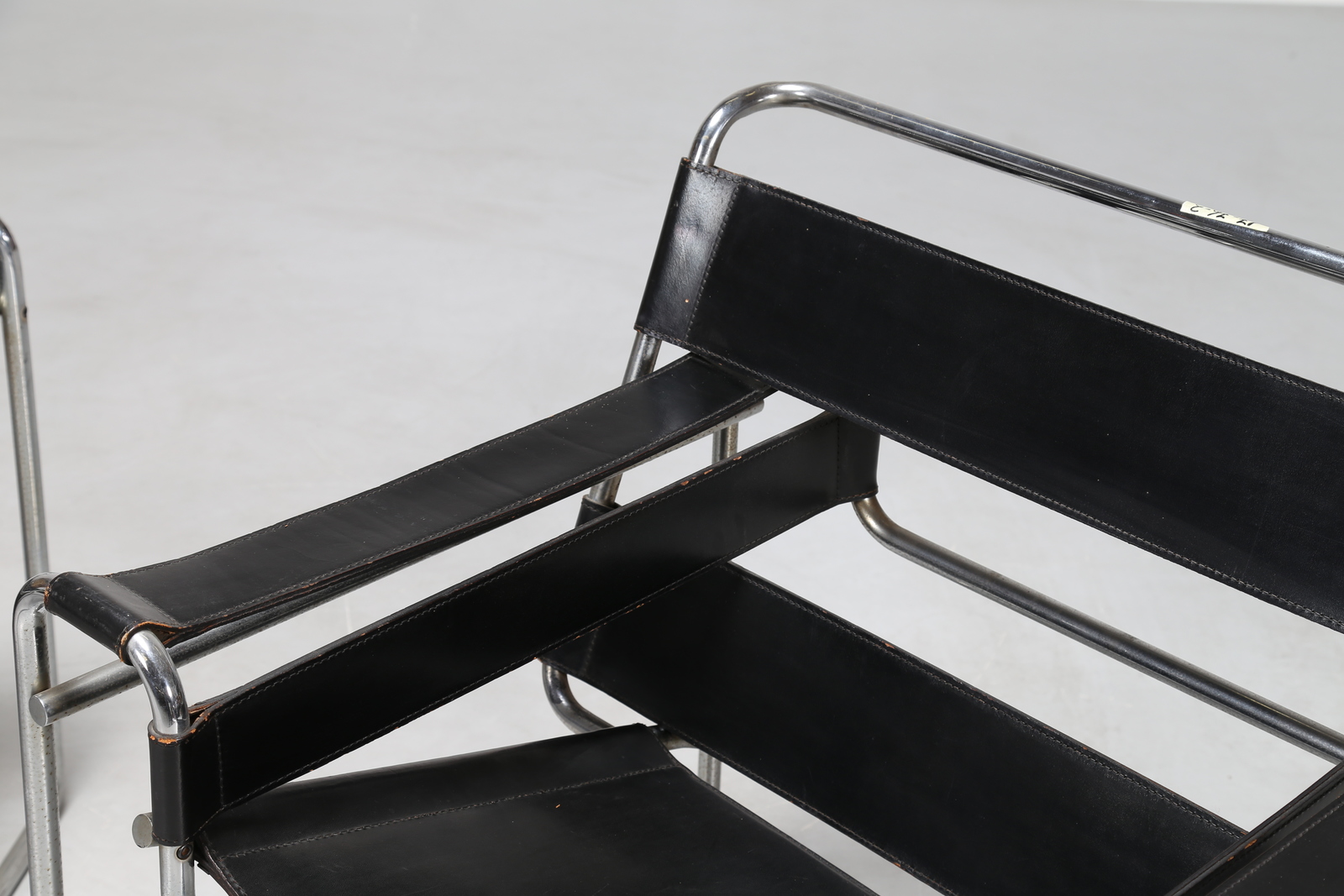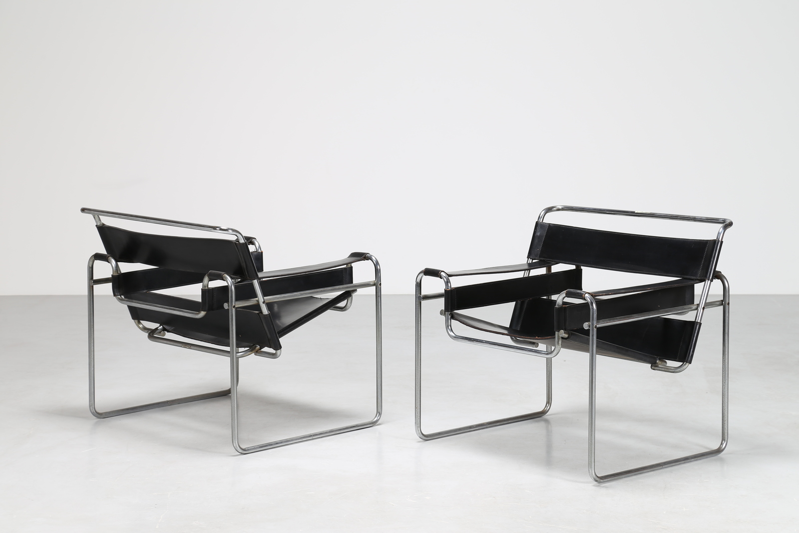 BREUER MARCEL LAJOS (1902 - 1981) Coppia di poltrone in metallo cromato e cuoio nero mod. Wassily, per Gavina Anni 60 . -. Cm 78,00 x 74,00 x 68,00.