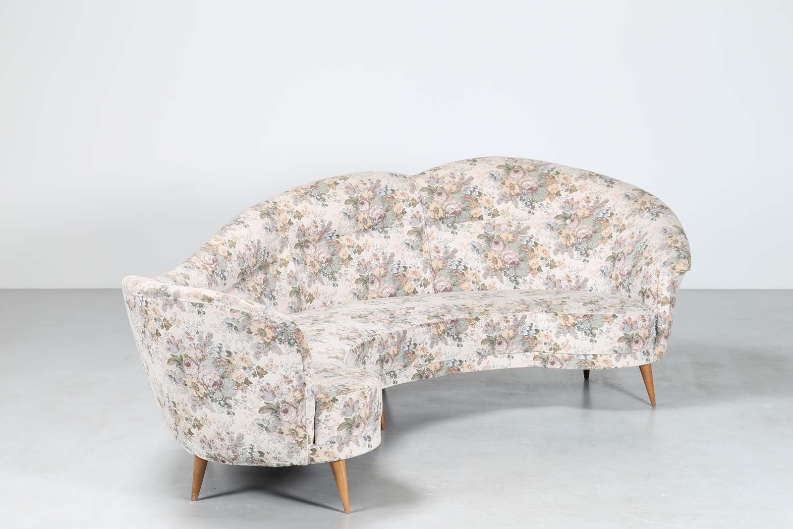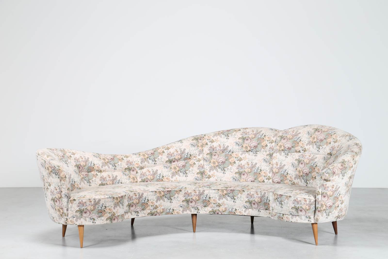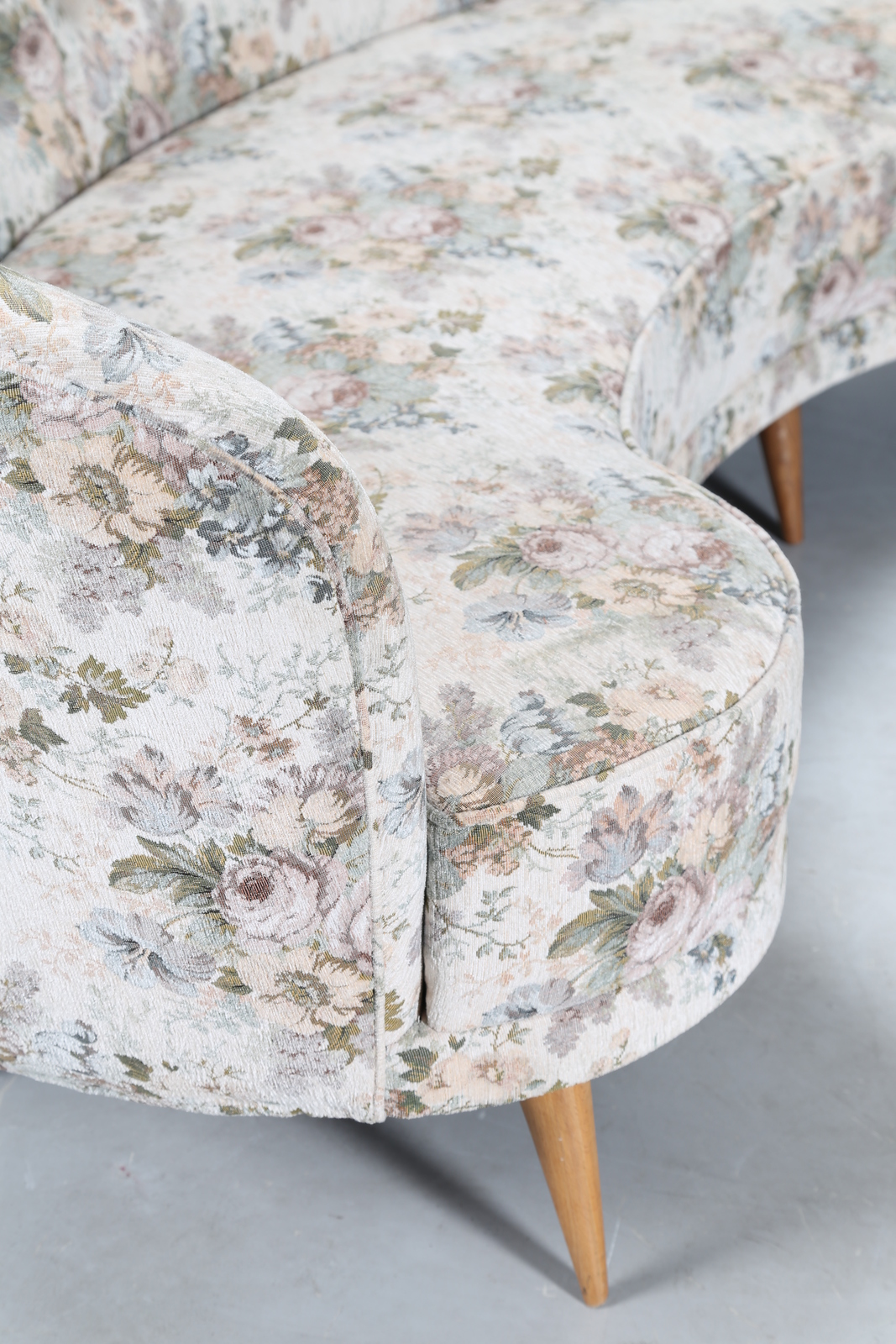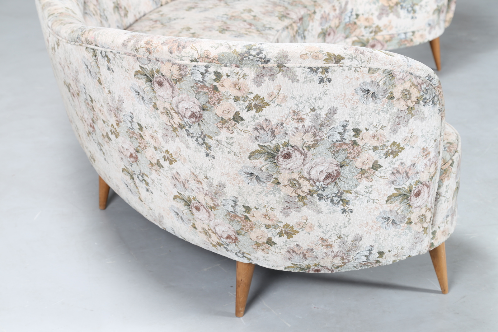 Lotto 350 | MANIFATTURA ITALIANA Divano curvo in tessuto e legno, anni 50. -. Cm 277,00 x...