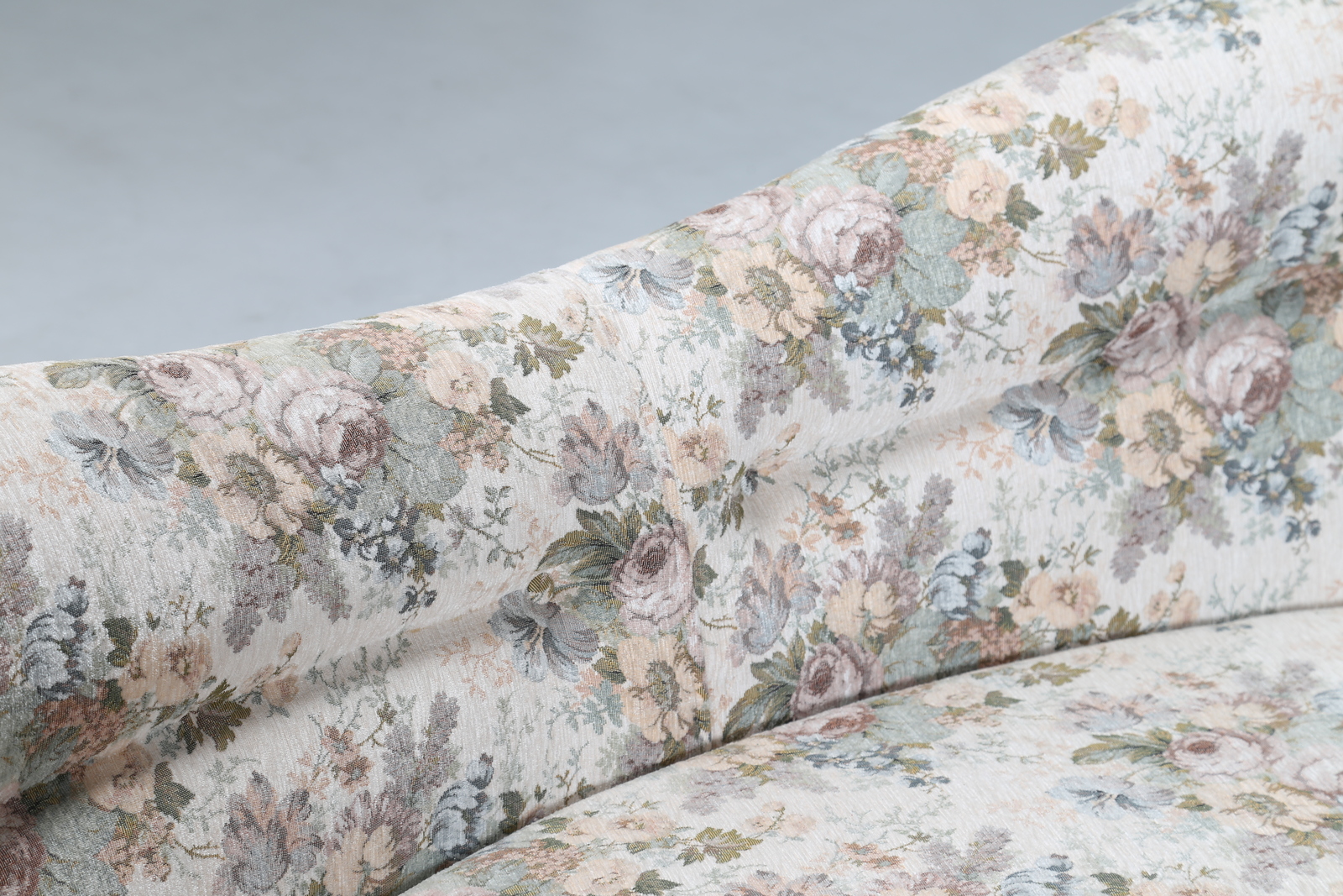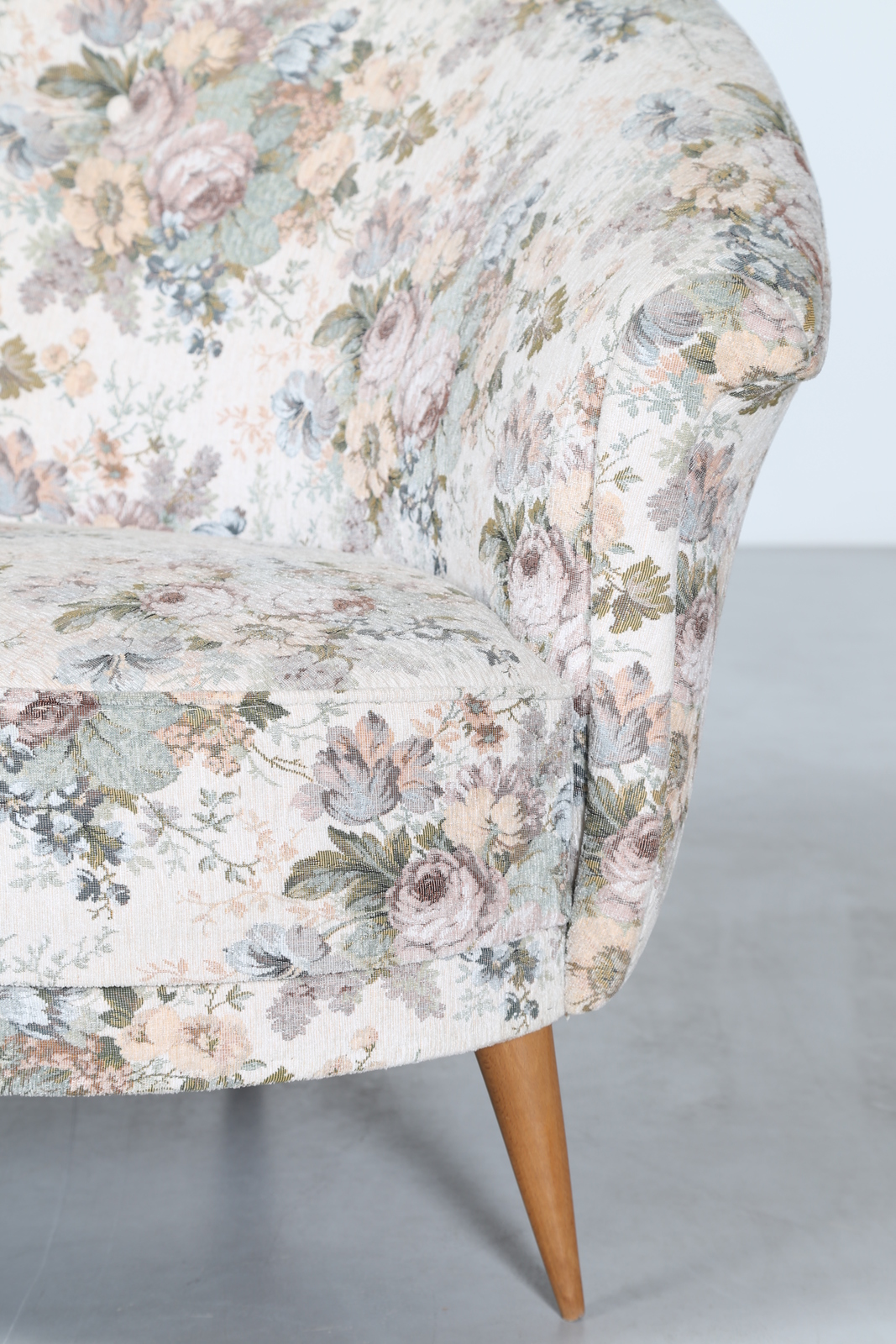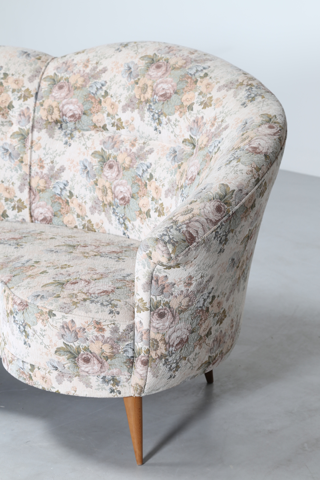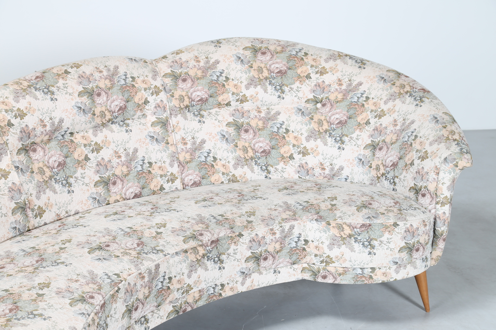Lotto 350 | MANIFATTURA ITALIANA Divano curvo in tessuto e legno, anni 50. -. Cm 277,00 x...