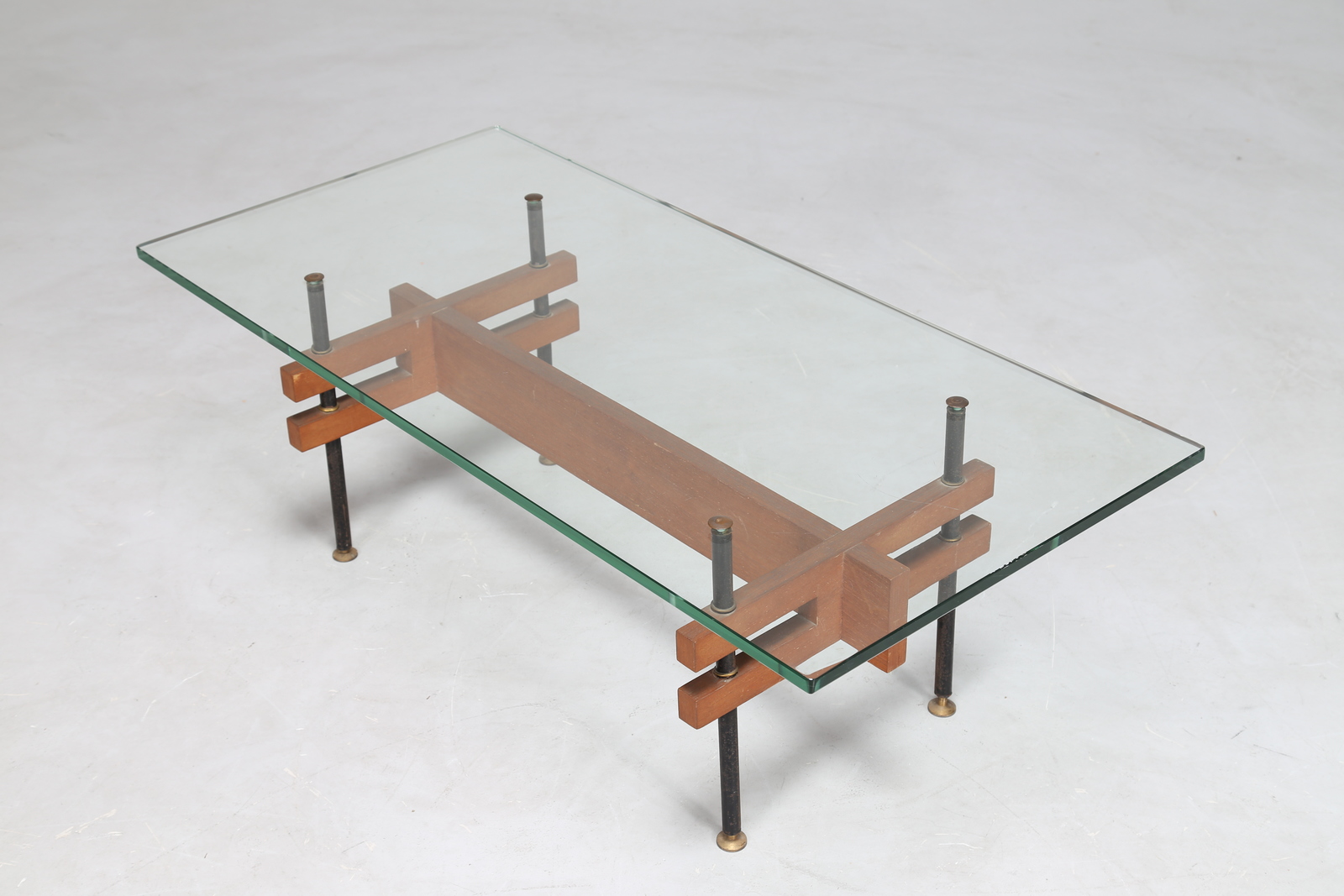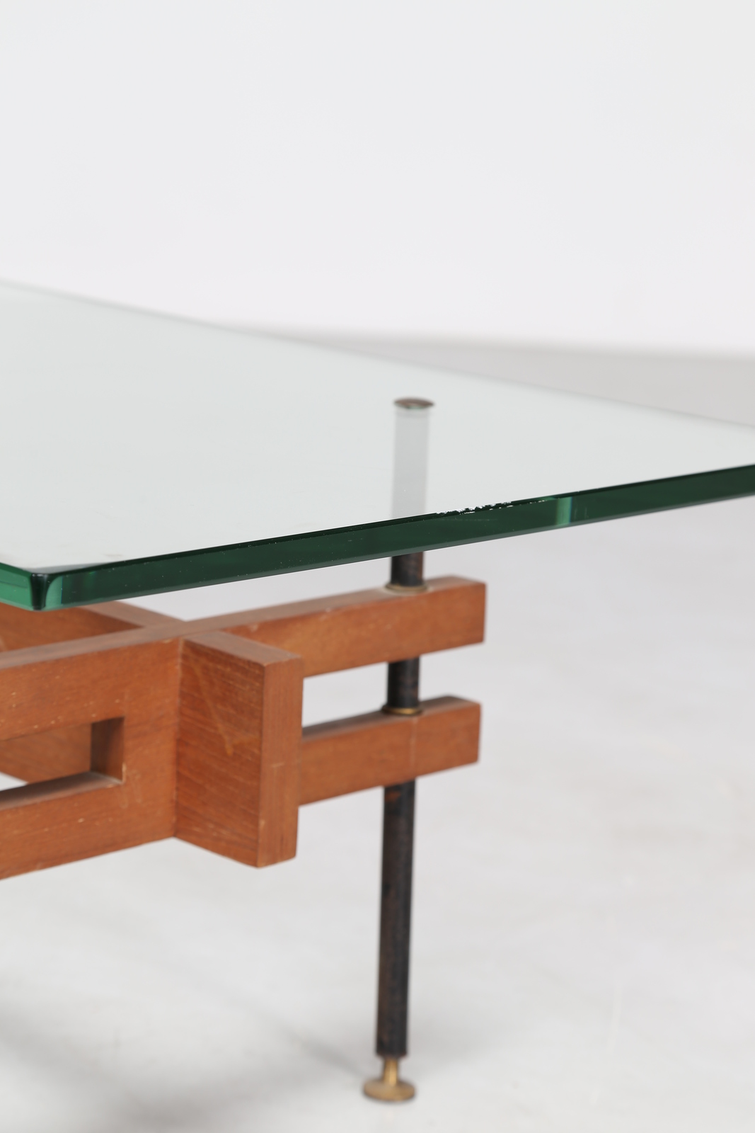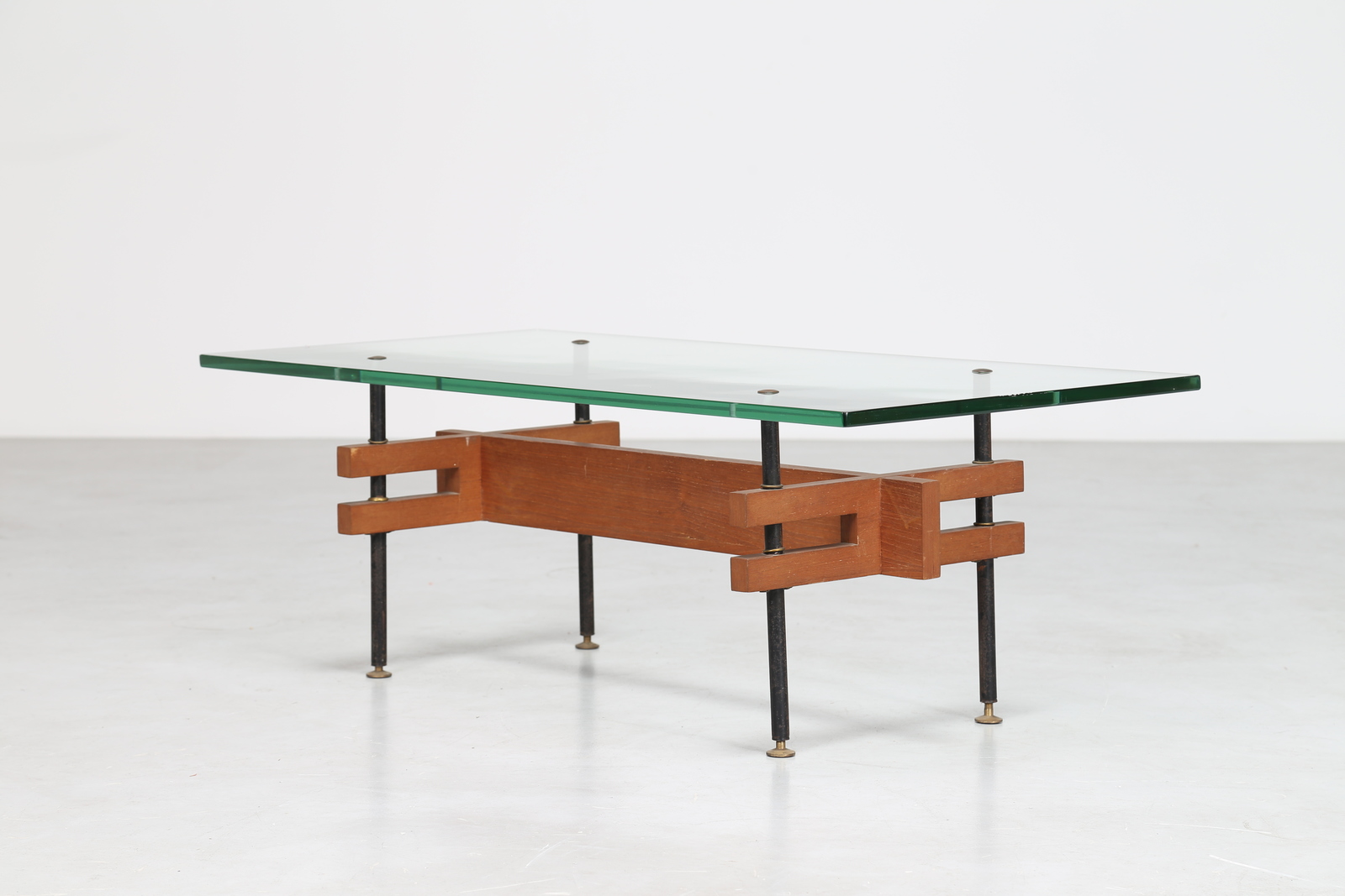 MANIFATTURA ITALIANA Tavolino da caffè in teak con dettagli in ottone e piano in cristallo, anni 50. -. Cm 107,00 x 37,00 x 51,00.
