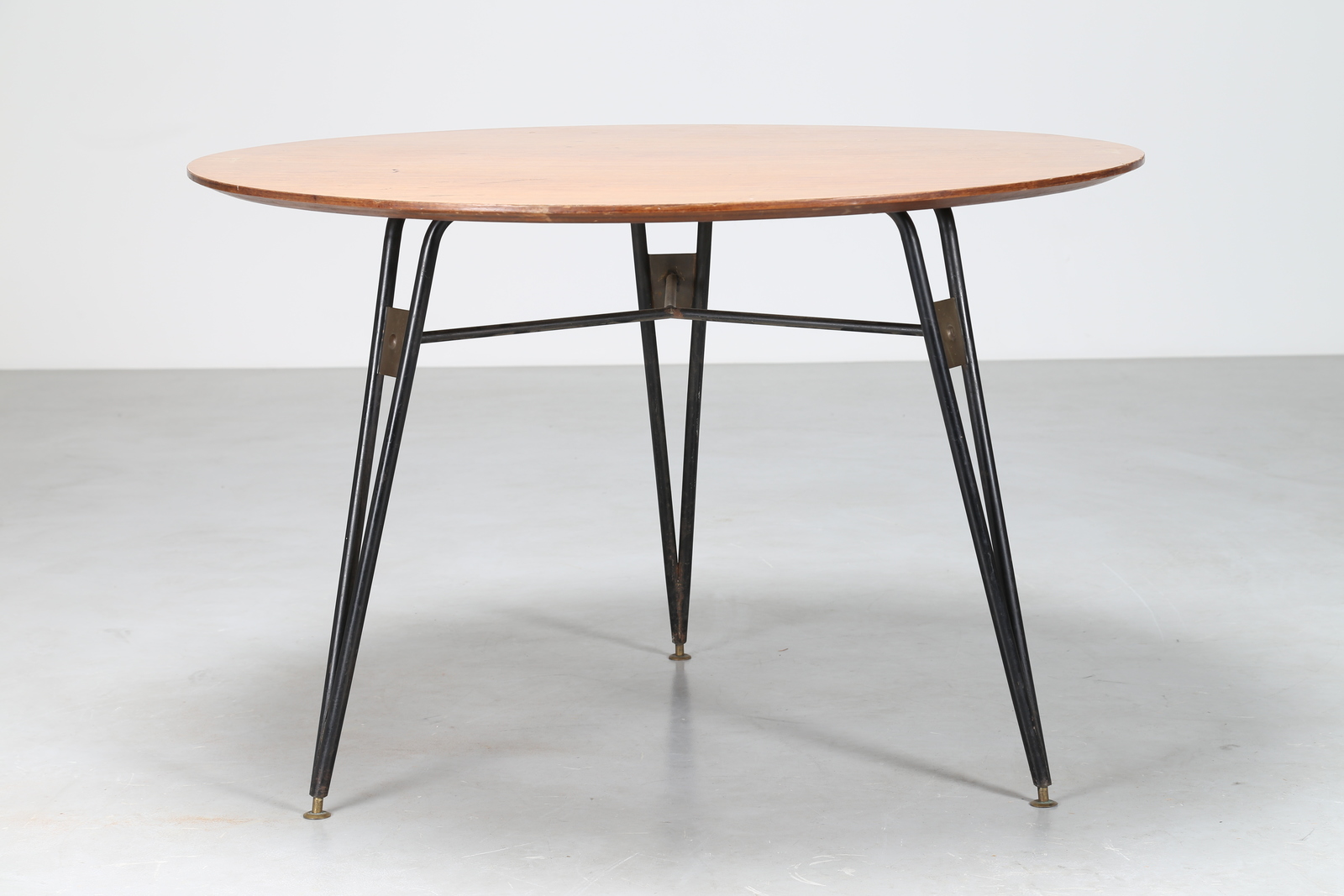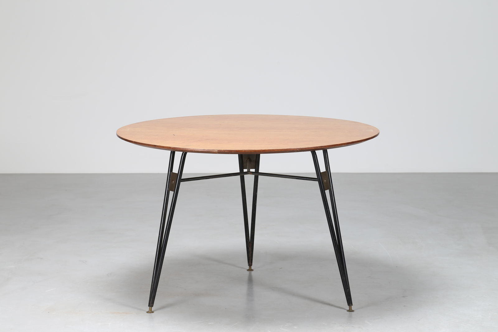 ISA BERGAMO Attrib. Tavolo rotondo con struttura in tondino di ferro, ottone e piano in teak, anni 50. -. Cm 114,00 x 75,00 x 114,00.