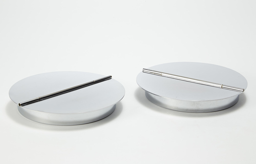 Luigi Caccia Dominioni (Milano 1913 - Milano 2016) Coppia di posacenere "0G7 Marcel". Produzione Azucena, Milano anni 70. Metallo cromato (d cm 17) (lievi difetti) A pair of ashtrays model "0G7 Marcel". Produced by Azucena, Milan, 1970s. Chromed metal (d cm 17) (minor defects)