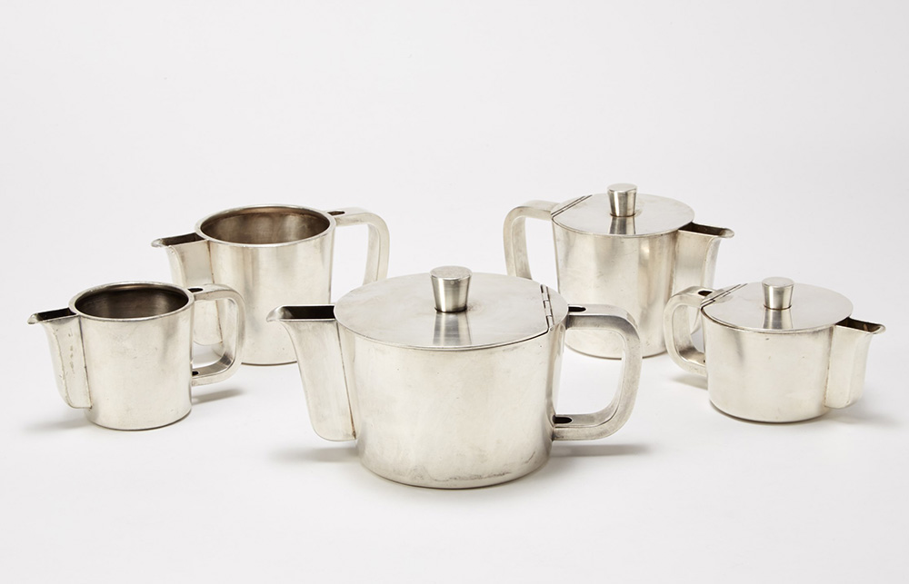 Gio Ponti (Milano 1891 - 1979) Parte di servizio serie "VI Triennale" composto da cinque pezzi in alpacca. Produzione Arthur Krupp Milano, 1936 ca, marcate sotto la base "Jolly Hotels" (misure diverse) (difetti e mancanze) Bibliografia: "Domus", n. 143, novembre 1939, p. 3 Part of "VI Triennale" set comprising five nickel silver pieces. Produced by Arthur Krupp, Milan, 1936 ca. Marked under the base "Jolly Hotels" (defects and losses) Bibliography: "Domus", n. 143, novembre 1939, p. 3