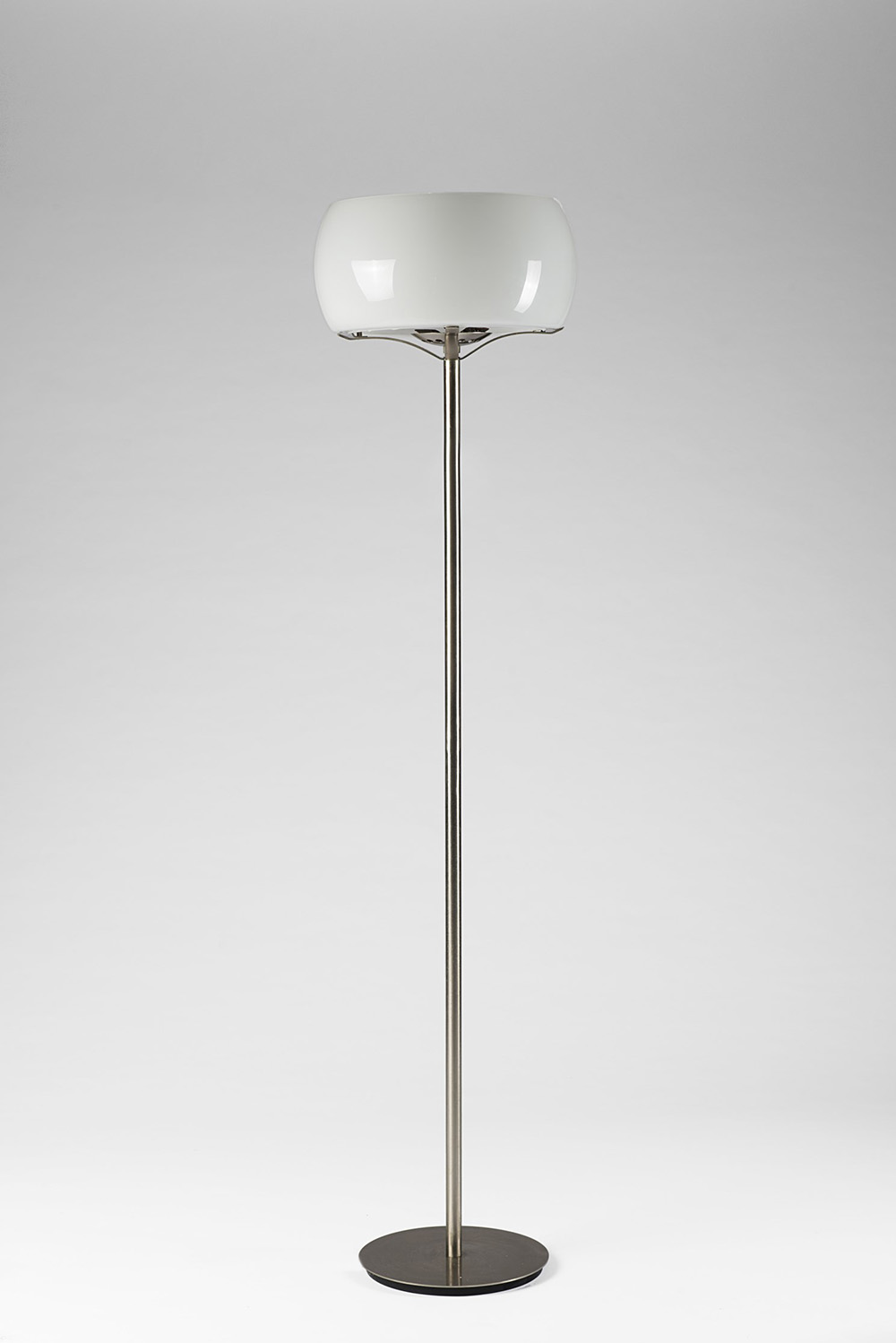 Vico Magistretti (Milano 1920 - Milano 2006) Lampada da terra modello "Clitunno". Produzione Artemide, Milano, 1964. Ottone nichelato e vetro lattimo incamiciato (h cm 165) (lievi difetti e mancanze) Bibliografia: "Ottagono", n. 10, luglio 1968, p. 58; G. Gramigna, Repertorio del design italiano 1950/2000 per l'arredamento domestico, Torino, Allemandi 2003, vol 1, p. 113 Floor lamp model "Clitunno". Produced by Artemide, Milan, 1964. Brass and glass (h cm 165) (minor defects and losses) Bibliography: "Ottagono", n. 10, luglio 1968, p. 58; G. Gramigna, Repertorio del design italiano 1950/2000 per l'arredamento domestico, Torino, Allemandi 2011, vol 1, p. 113