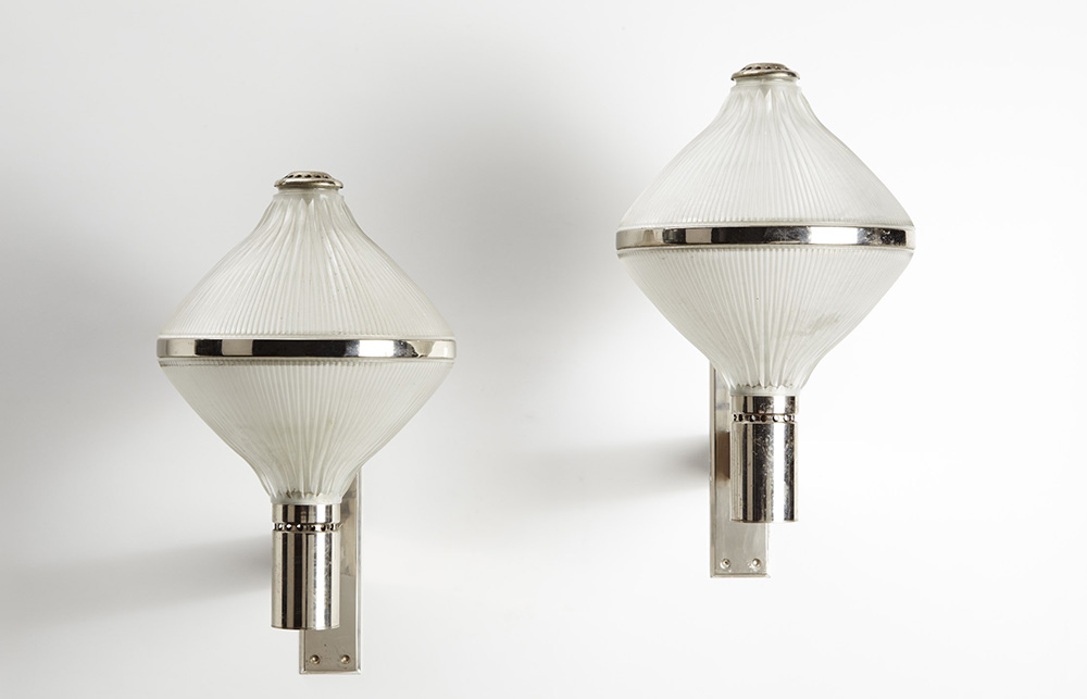 BBPR (Lodovico Barbiano di Belgiojoso, Enrico Peressutti, Ernesto Nathan Rogers) ( ) Coppia di lampade da parete modello "Polimnia". Produzione Artemide, Milano, 1970 ca. Metallo cromato, vetro pressato in stampo (h cm 50) (lievi difetti) A pair of wall lamps model "Polimnia". Produced by Artemide, Milan, circa 1970. Chromed metal, glass (h cm 50) (minor defects)
