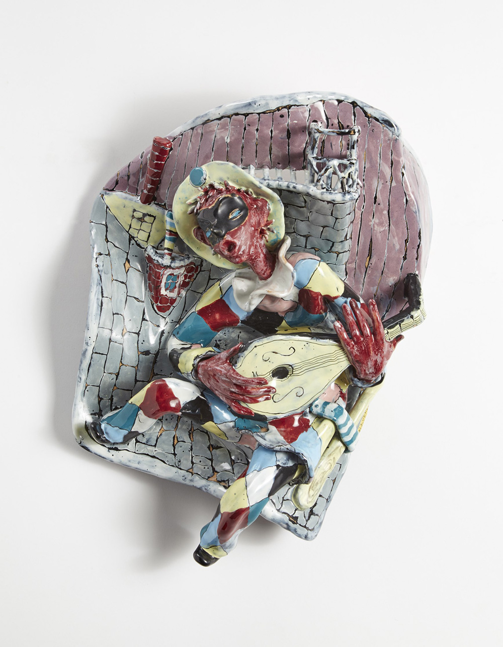 Otello Rosa ( 1920 ) "Maschere a Venezia. Composizione n. 5". Applique in ceramica decorata a rilievo con Arlecchino policromo sotto vetrina. Manifattura San Polo, Venezia, anni 50. Firmata e iscritta al verso (h cm 40) "Maschere a Venezia. Composizione n. 5". Ceramic applique with polychrome Arlequin. San Polo manufacture, Venice, 1950s. Signed (h cm 40)