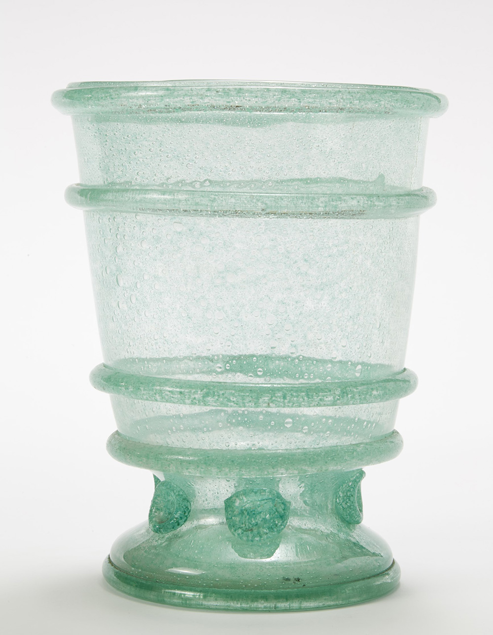 Seguso Vetri d'Arte (attribuito) Vaso in vetro verdino pulegoso con fasce e borchie applicate a caldo. Murano, anni 30/40 (h cm 28) Glass vase. Murano, 1930s/40s (h cm 28)