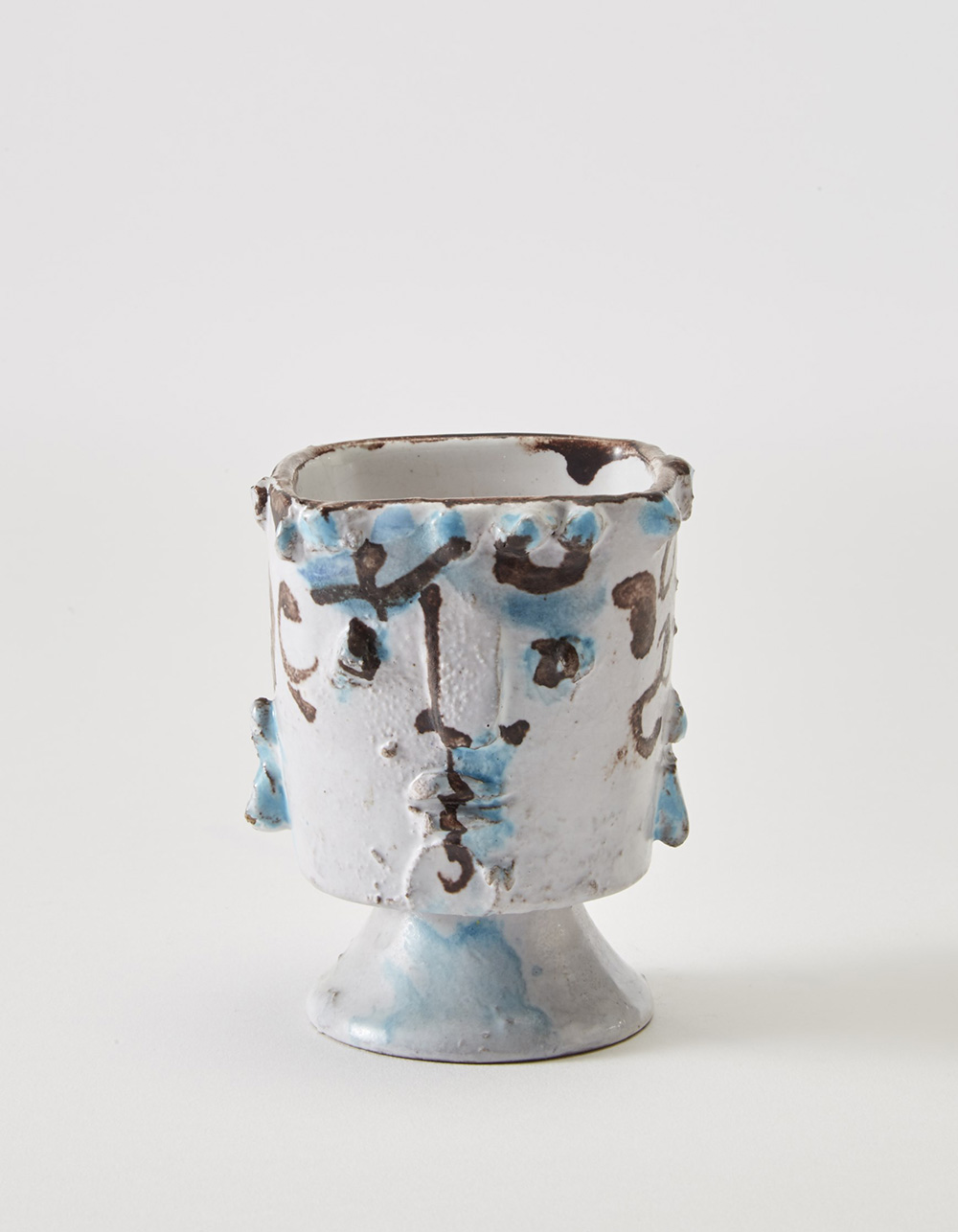 Emanuele Luzzati (Genova 1921 - 2007) Coppetta in ceramica smaltata in policromia raffigurante volti umani su fondo bianco nei toni del celeste e del marrone. Albisola Marina, anni 60 (h cm 9,5) A small ceramic bowl with human faces. Albisola Marina, 1960s (h cm 9,5)