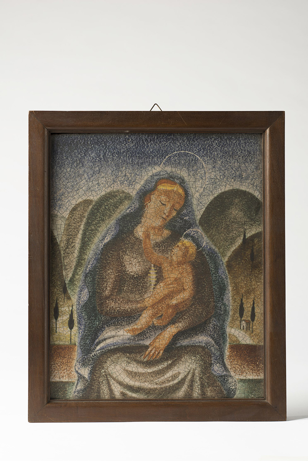 "Madonna con bambino", formella in ceramica dipinta ascrivibile ad un artista aderente alla corrente del Ritorno all'ordine. Italia, anni 20. In cornice (cm 35x26) "Madonna with child", ceramic tile painted by a "Return to order" artist. Italy, 1920s. Framed (cm 35x26)