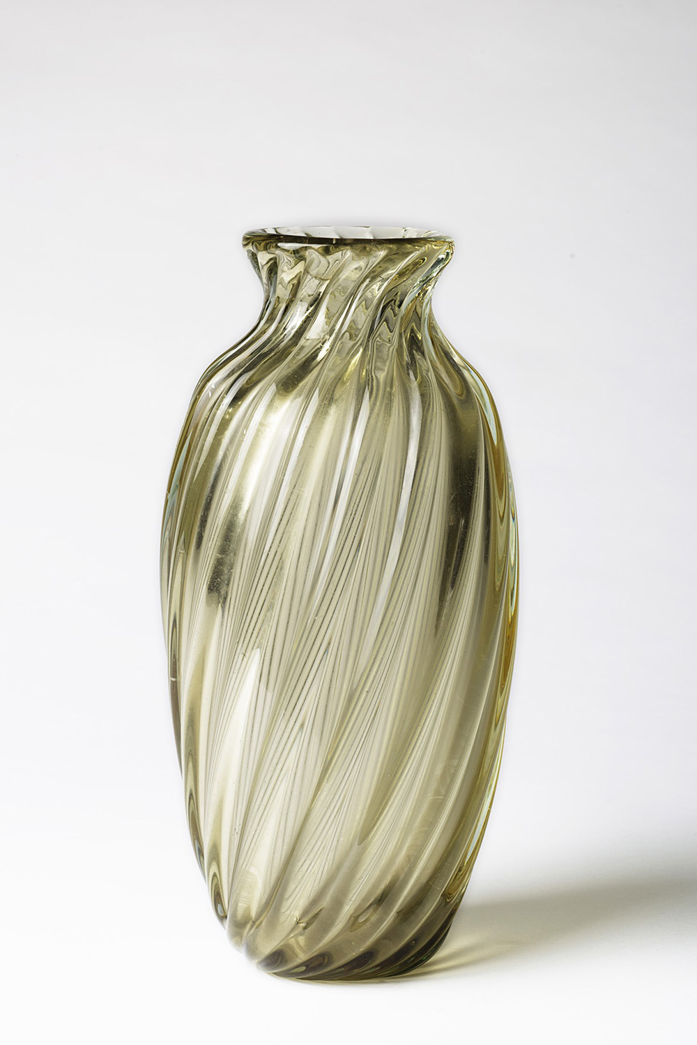 Manifattura di Murano Vaso in vetro pagliesco di forte spessore, costolato a spirale. Anni 40. Firmato all'acido "venini murano ars" sotto la base (h cm 38) Murano Manufacture Glass vase. 1940s. Signed under the base "venini murano ars" (h cm 38)