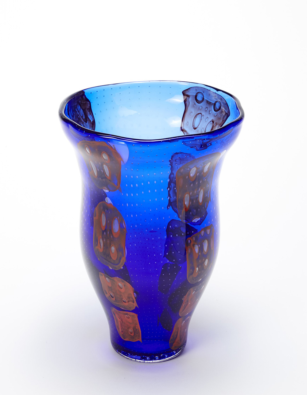 Franco Raggi "Tacon", vaso in vetro trasparente blu con inclusione di bolle regolari e macchie in vetro rosso corniola con bolle ai vertici. Manifattura Barovier & Toso, Murano 1995. Firmato a punta sotto la base (h cm 31) Bibliografia: M. Barovier, Il vetro a Venezia. dal moderno al contemporaneo, Motta, Milano 1999, p. 322-323 "Tacon", glass vase. Barovier & Toso manufacture, Murano 1995. Signed under the base (h cm 31) Bibliography: M. Barovier, Il vetro a Venezia. dal moderno al contemporaneo, Motta, Milano 1999, p. 322-323