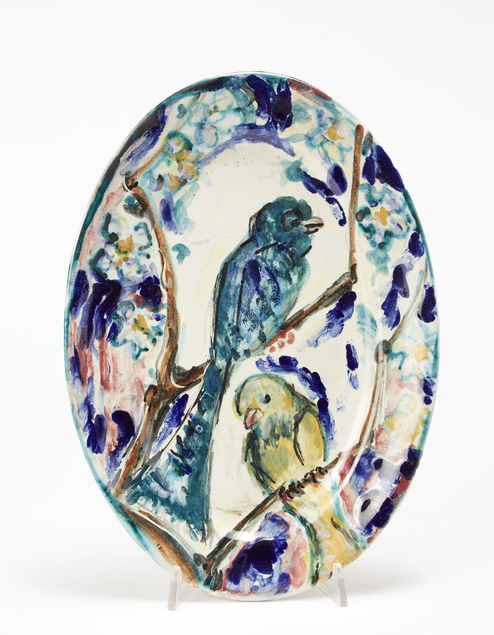 Piero Gauli (Milano 1916 - 2012) Piatto ovale decorato con figura di uccelli sotto vetrina. Fine anni 40, prima met‡ degli anni 50. Firmato sotto la base (cm 33x24) Oval plate with birds. 1940/50s. Signed under the base (cm 33x24)