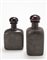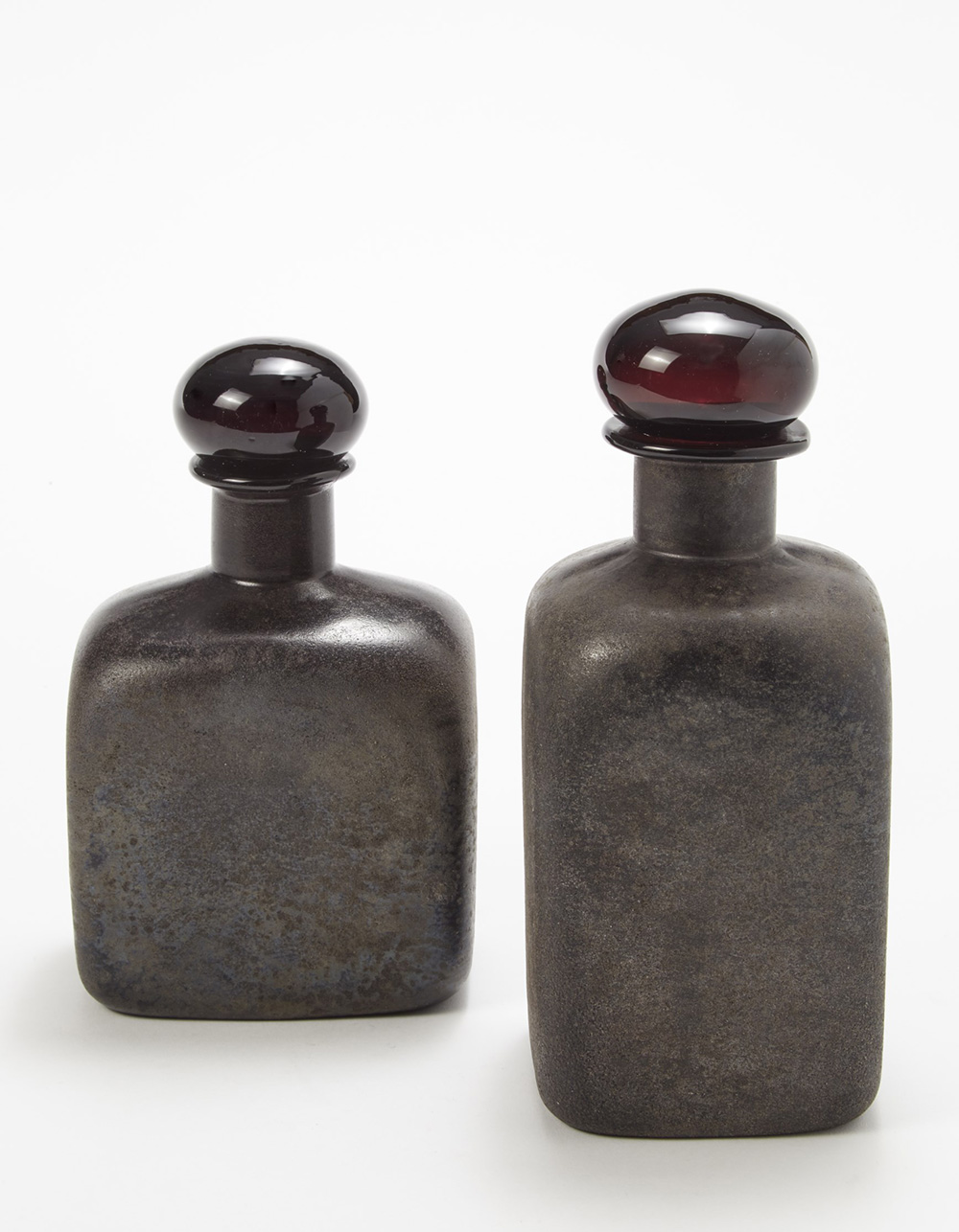 Alfredo Barbini ( 1912 - 2007) Lotto composto da due bottiglie con tappo. Vetro ametista scuro corroso e scabro sulla superficie esterna. Murano, 1968 ca. (h max cm 25) (difetti) Two glass bottles. Murano, 1968 ca. (h max cm 25) (defects)