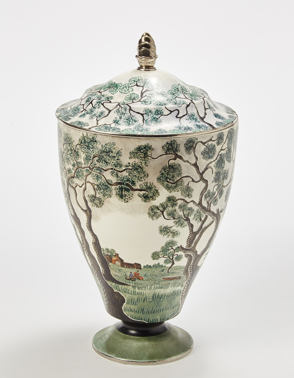 Guido Andlovitz e Carla Bossi Cista in ceramica policroma modello "Monza 32". Societ‡ Ceramica Italiana Laveno, Lavenia, 1942. Decorata a mano in policromia e argento con paesaggio alberato e figure. Disegno del modello di Guido Andlovitz, decoro di Carla Bossi. Monogramma della manifattura Lavenia numerale 6-39 4 in nero, firma della decoratrice e data 2-2-42 in oro sotto la base (h cm 45) (difetti e restauri) Bibliografia: Andloviz. Il decoro in tavola. Forme e colori, a cura di A. Pansera e M. Chirico, Allemandi, Torino 2011, p. 93 Ceramic vase model "Monza 32". Societ‡ Ceramica Italiana Laveno, Lavenia, 1942. Hand painted. Vase designed by Guido Andlovitz, decoration designed by Carla Bossi. Lavenia monogram and number "6-39 4", Carla Bossi's signature and date 2-2-42 under the base (h cm 45) (defects and restorations) Bibliography: Andloviz. Il decoro in tavola. Forme e colori, a cura di A. Pansera e M. Chirico, Allemandi, Torino 2011, p. 93