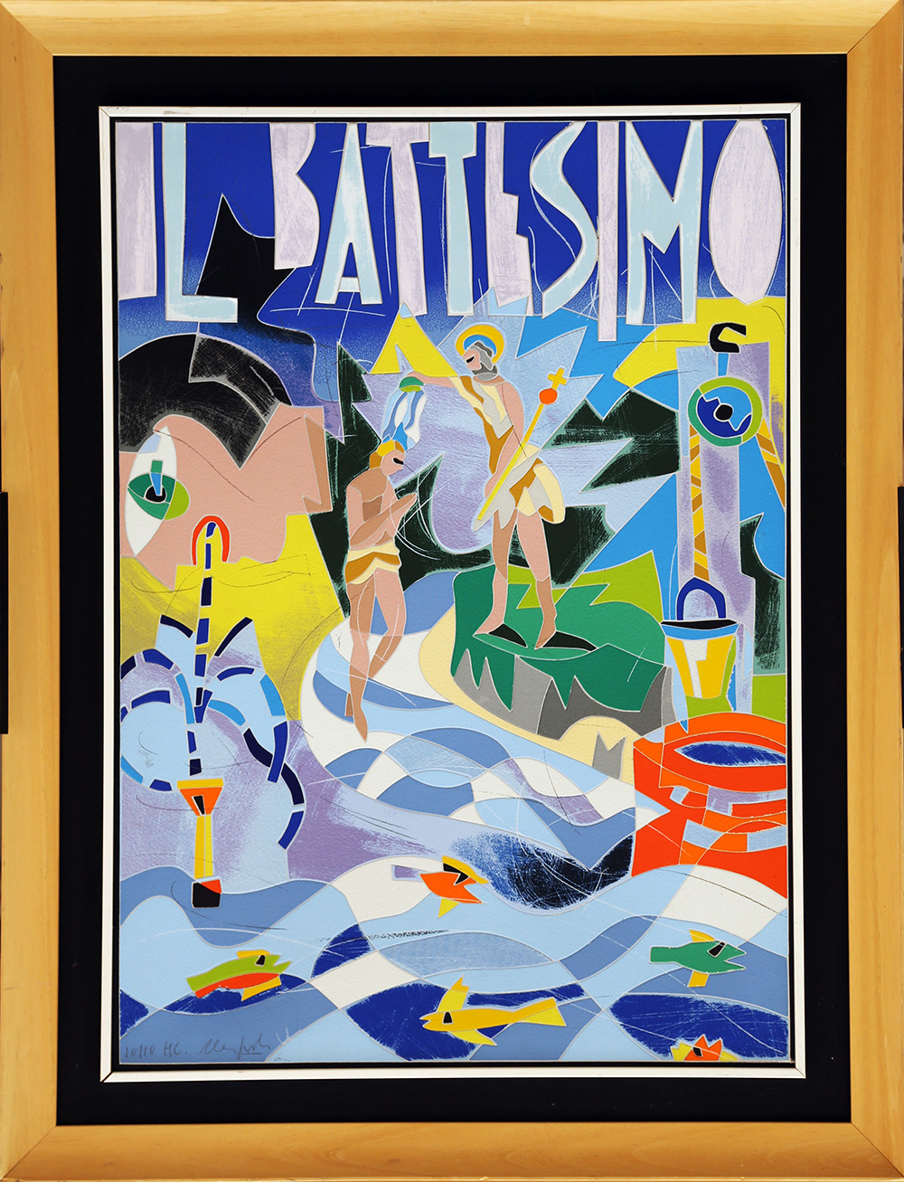 Ugo Nespolo Serigrafia con fustellatura e applicazioni 50x70 numero 10-10 MC "Il battesimo"