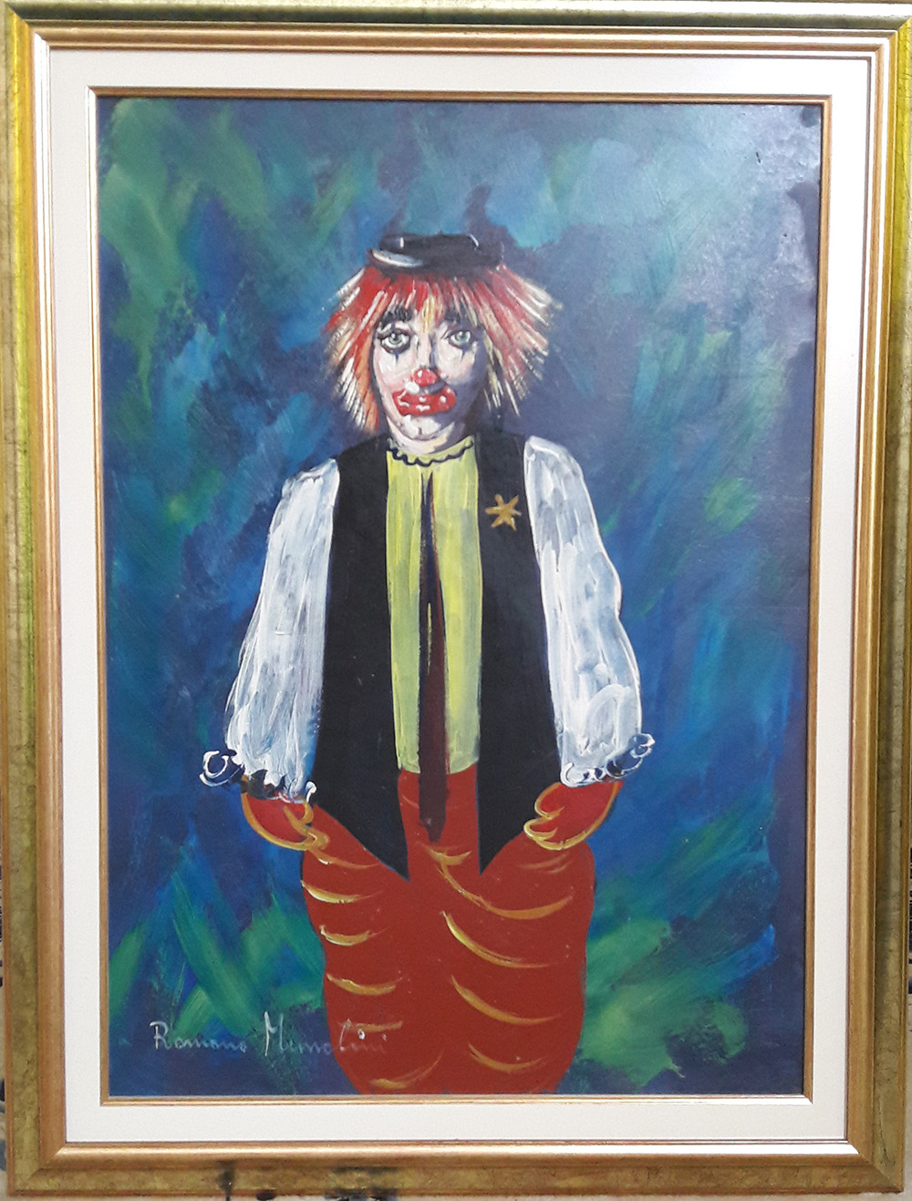 Romano Mussolini "Il re del circo" - Olio su masonite - cm 70x50 - Firma in basso a sx - Etichetta e Timbro Galleria Garavini Cesena