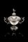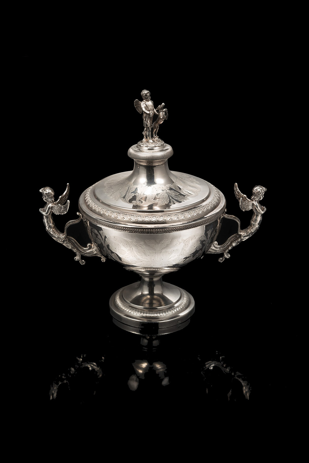 Zuccheriera in argento di forma circolare con piede e coperchio rastremati, decorata a cinture godronate, motivi fogliati cesellati; manici e pomolo in figura di angeli e cane. Roma, argentiere Giannotti Angelo, 1824-65 (h. cm 22, largh. cm 21,5) (gr 500 ca) (lievi difetti) A silver sugar bowl. Silversmith Giannotti Angelo, Rome, 1824-65 (h. cm 22, width cm 21,5) (gr 500 ca) (minor defects)