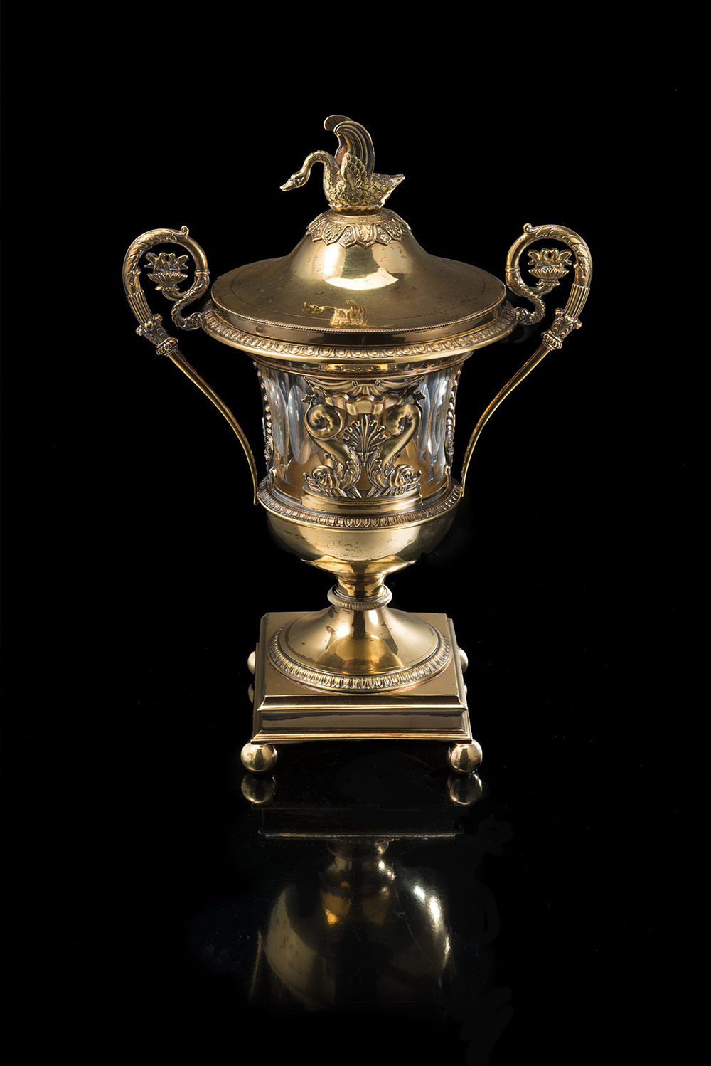 Zuccheriera in argento dorato e vetro, con corpo ad urna su plinto sorretto da quattro sfere e coperchio a cupola, decorata con tritoni, conchiglie, anthemia e cinture godronate; manici ad ansa fogliata e pomolo in figura di cigno. Parigi 1819-38 (h. cm 26x18) (gr 490 ca. senza vetro) (lievi difetti) A vermeil sugar bowl, Paris 1819-38 (h. cm 26x18) (gr 490 ca. without glass) (defects)