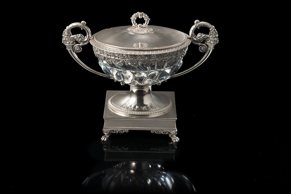 Compostiera con coperchio, in argento e cristallo, di forma circolare su plinto quadrato a quattro piedi ferini, con coppa baccellata, decorata da fascia con tralcio di vite e godronature; manici ad ansa e pomolo a ghirlanda. Parigi, 1819-38, argentiere Maison Odiot (h. cm 21; largh. cm 25) (gr lordi 1325 ca.) (difetti) A silver and crystal bowl. Silversmith Maison Odiot, Paris 1819-38 (h. cm 21; width cm 25) (gr 1325 ca.) (defects)