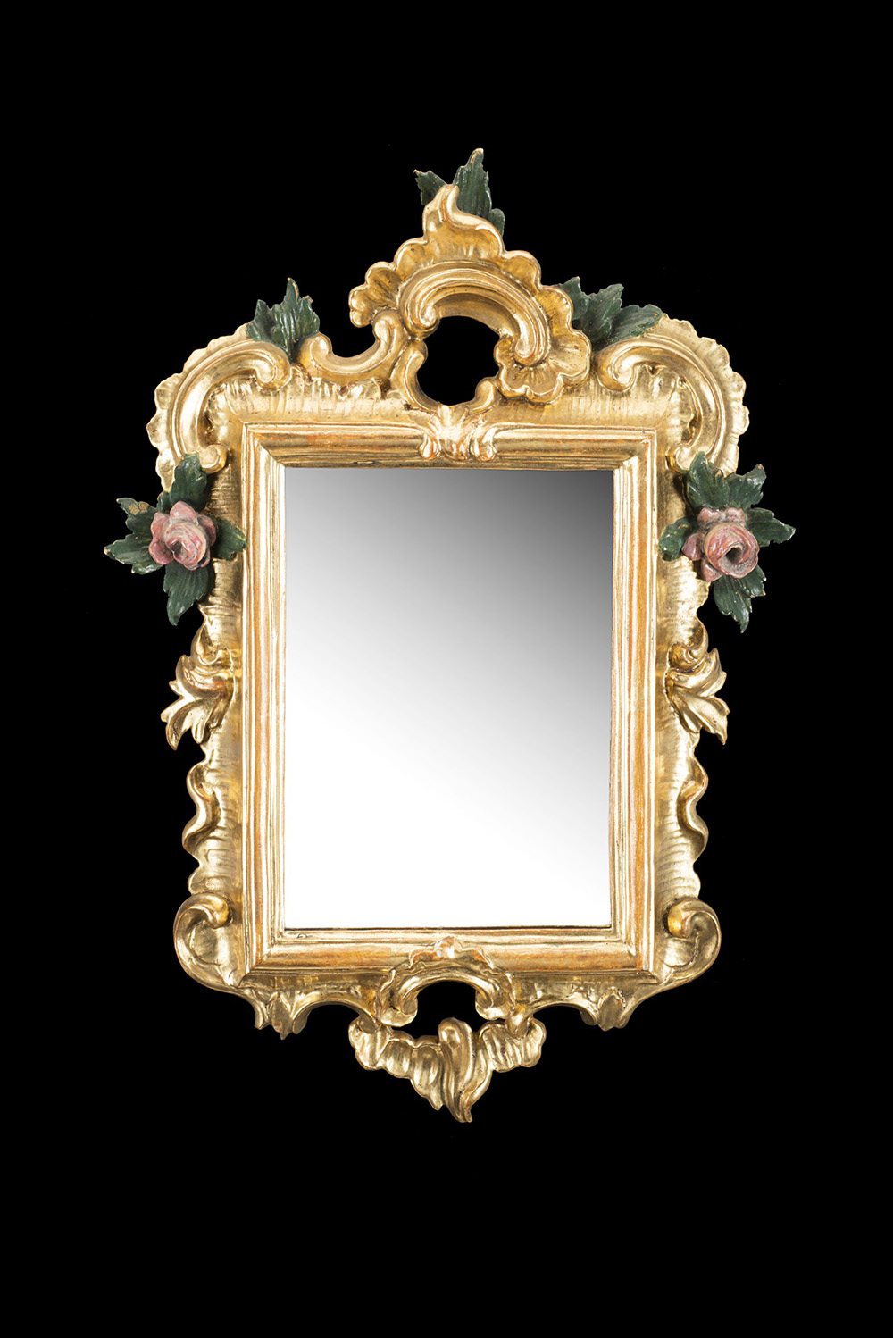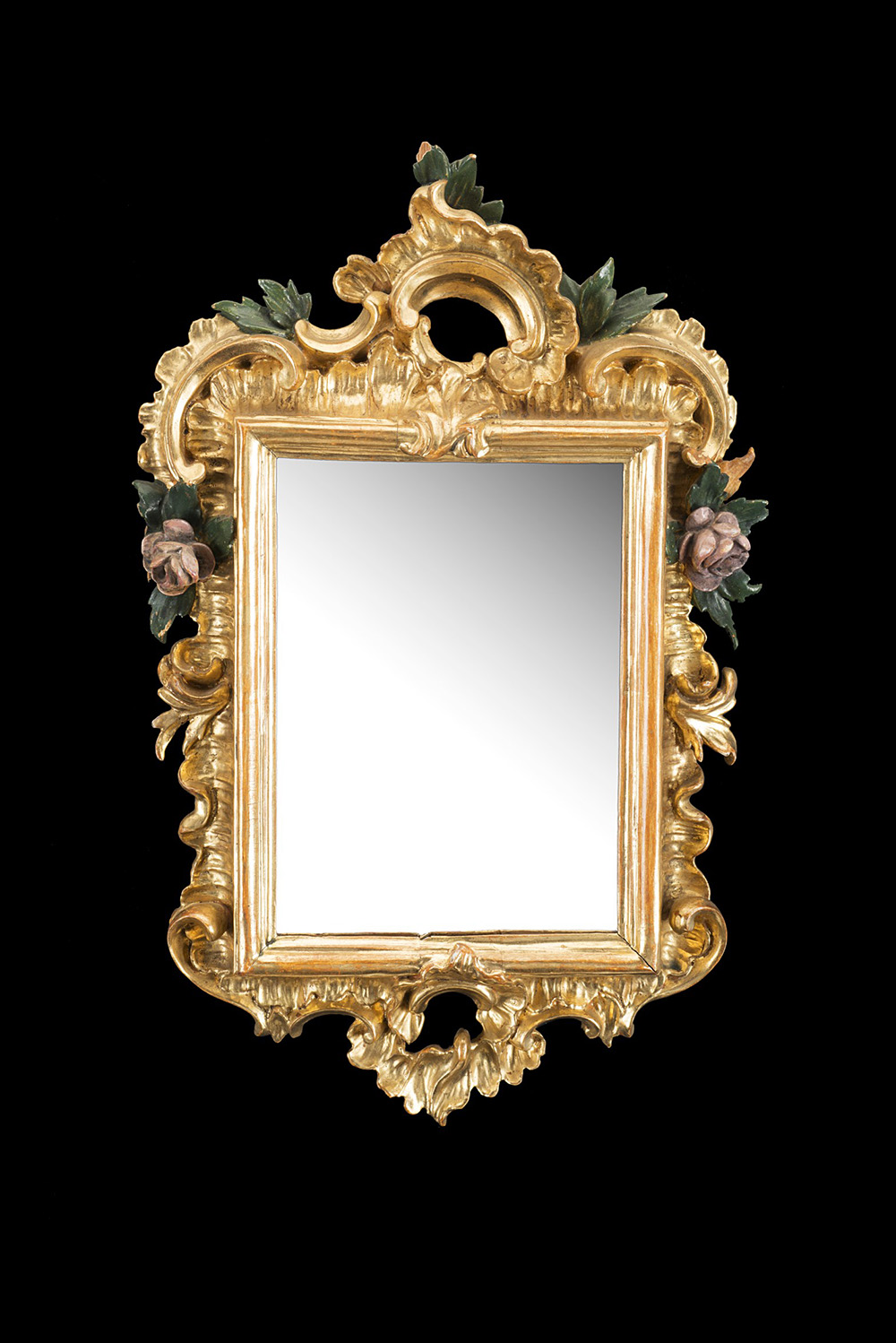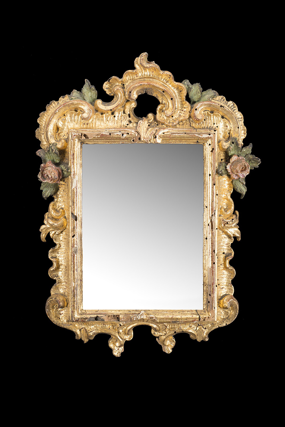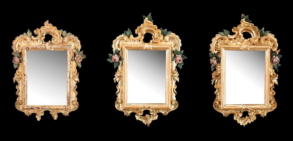 Lotto di tre piccole specchiere in legno intagliato e dorato in policromia a fiori e foglie, fregi traforati, epoche diverse (cm 33x21) (difetti e mancanze) Three small giltwood mirrors of different periods (cm 33x21) (defects and losses)