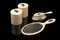 Servizio da toilette in avorio con cifre "DA" in argento, composto da: specchio a mano, due scatole cilindriche ed una spazzola (difetti) An ivory and silver toilet set (defects)