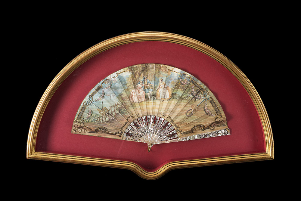Ventaglio con pagina decorata con scena galante entro paesaggio. Stecche in madreperla incise e decorate a fiori. Firmato in basso a destra, contenuto in teca di epoca posteriore A fan with mother of pearl ribs. Signed. Case of a later date