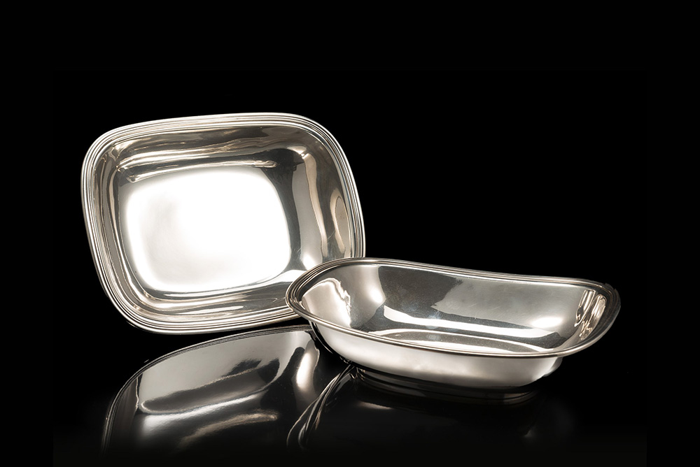 Coppia di centrotavola in argento di forma rettangolare e bordo modanato....