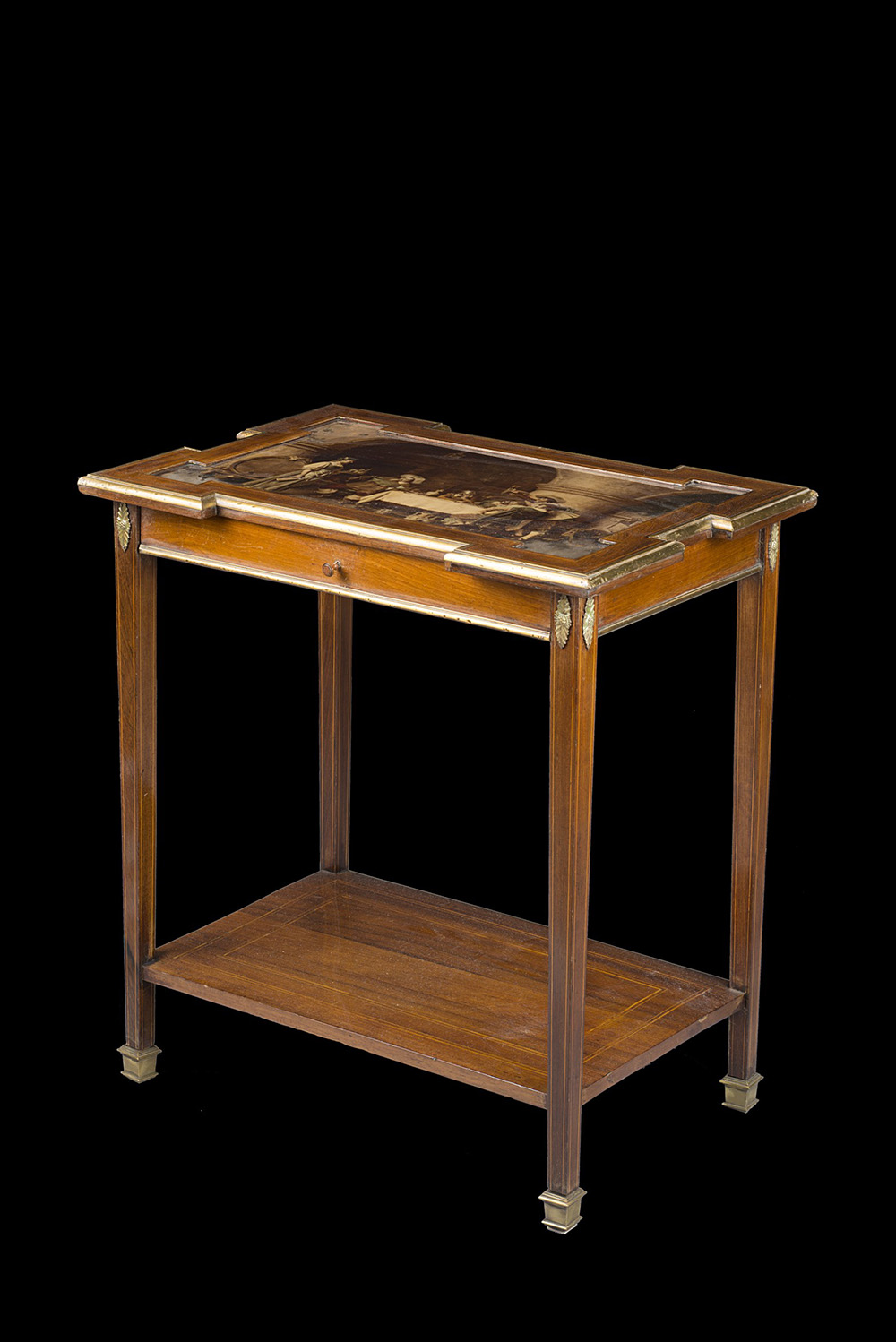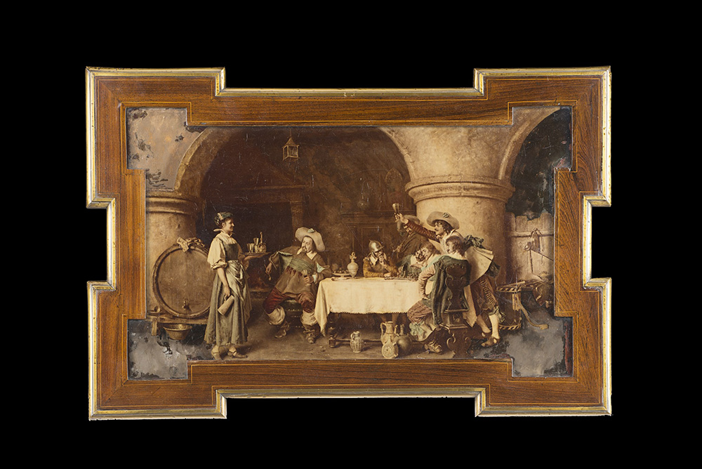 Tavolo da salotto in mogano con piano di forma sagomata, decorato da oleografia raffigurante taverna con figure. Fasce e montanti profilati in ottone. Gambe rastremate unite da pianetto. Francia, sec. XIX (cm 71x77x48) (difetti e restauri) A mahogany table. France, 19th century (cm 71x77x48) (defects and restorations)
