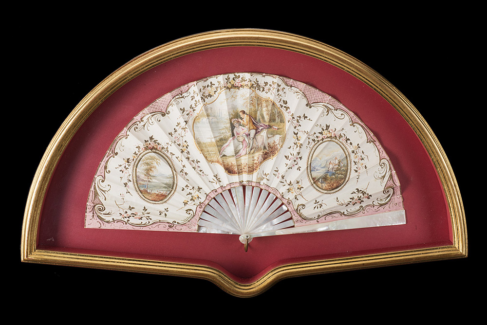 Ventaglio con stecche in madreperla e pagine in carta dipinta a riserve con scene galanti e paesaggi fluviali entro cornici con mazzi fioriti. Inizio del sec. XIX. In teca A fan with ivory ribs. Early 19th century. With case