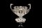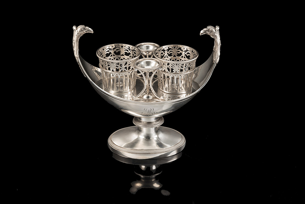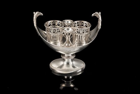 Servizio da tavola in argento con piede ovale godronato e corpo a navicella con prese fogliate ed estremit‡ a testa di rapace. Portabottiglie traforati a motivi stilizzati e fogliati. Parigi 1798-1809, argentiere Bouty Louis-Joseph. (h. cm 22,5; largh. cm 24) (gr 1200 ca.) (difetti) A silver cruet by Bouty Louis-Joseph, Paris 1789-1809 (h. cm 22,5; width. cm 24) (gr 1200 ca.) (defects)