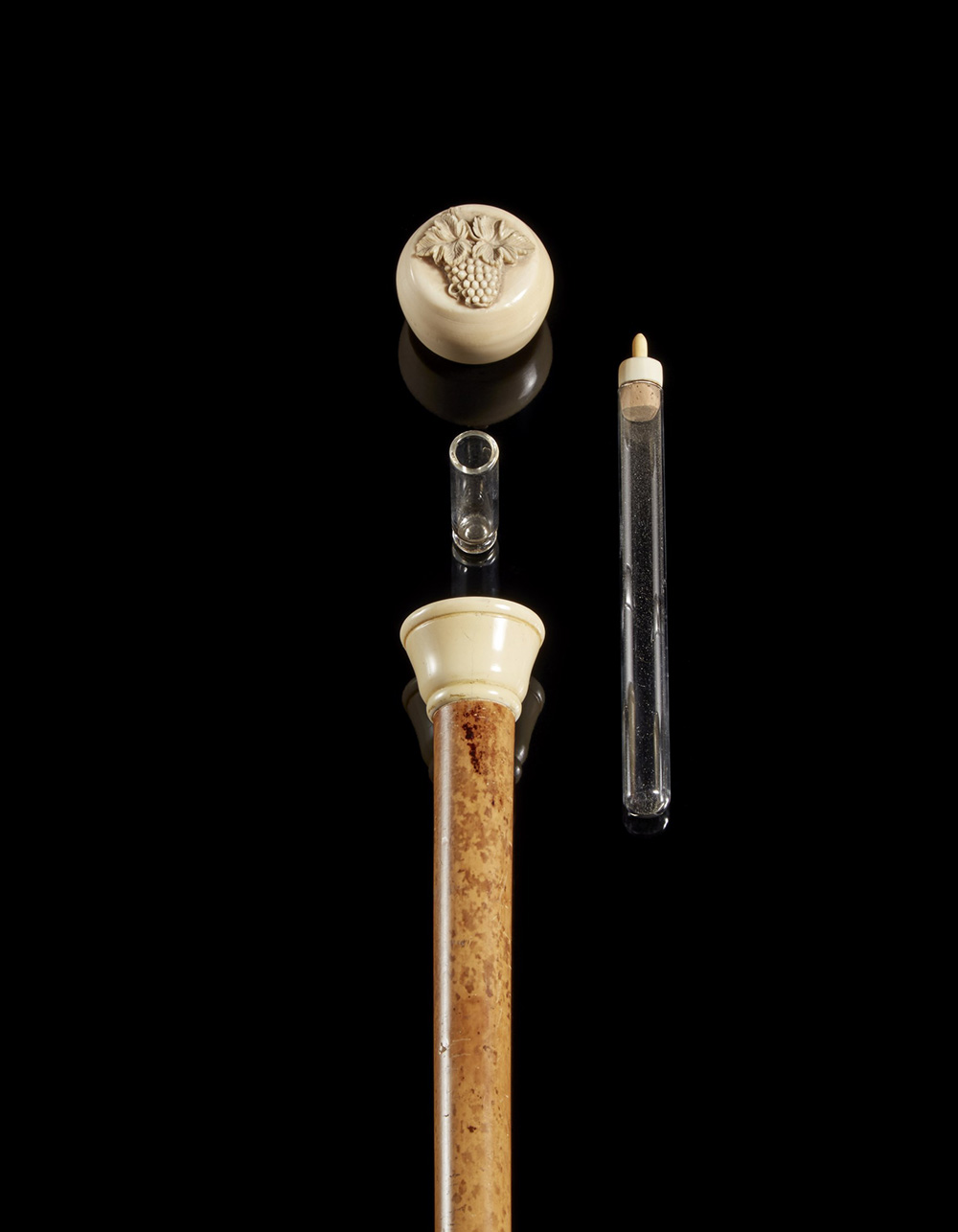 Bastone con canna in malacca e impugnatura sagomata in avorio intagliata a grappolo d'uva, celante bicchierino e fiaschetta in vetro. Sec. XIX A Malacca walking stick with ivory handle containing flask and glass. 19th century