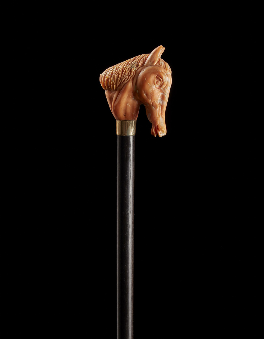 Bastone con canna in ebano e impugnatura in corallo scolpita a testa di cavallo. Ghiera in oro. Sec. XIX An ebony walking stick with coral handle. Gold collar. 19th century