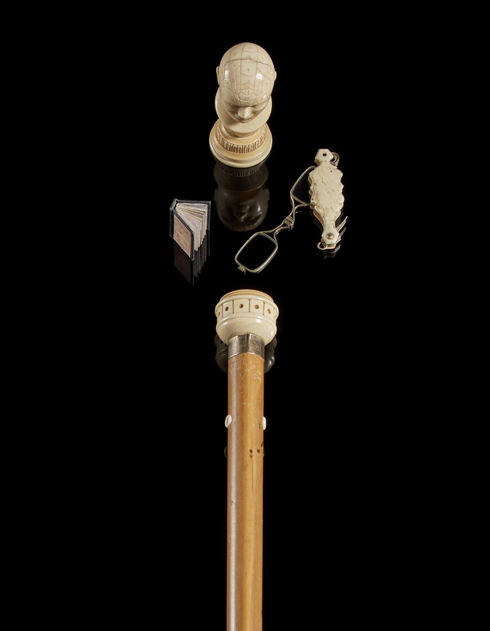 Bastone da frenologo con canna in legno con foro passante con laccio e lorgnette. Impugnatura in avorio a forma di cranio con sezioni numerate, celante piccolo libro. Ghiera in argento. Punzoni di Chester 1930 A wood walking stick with ivory handle containing phrenology accessories. Silver collar. Chester, 1930