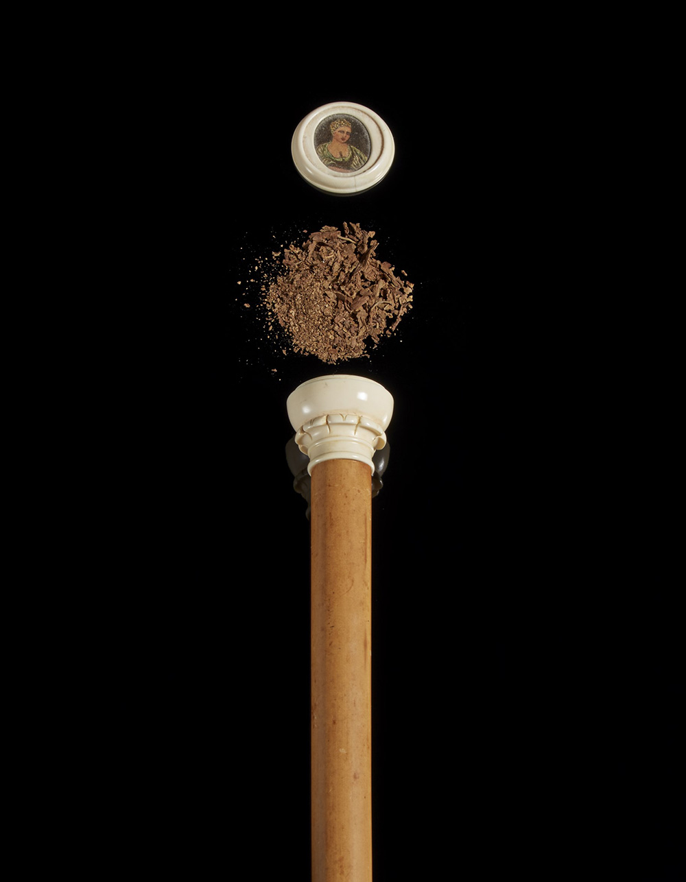 Bastone con canna in legno e presa in avorio con tabacchiera decorata da...