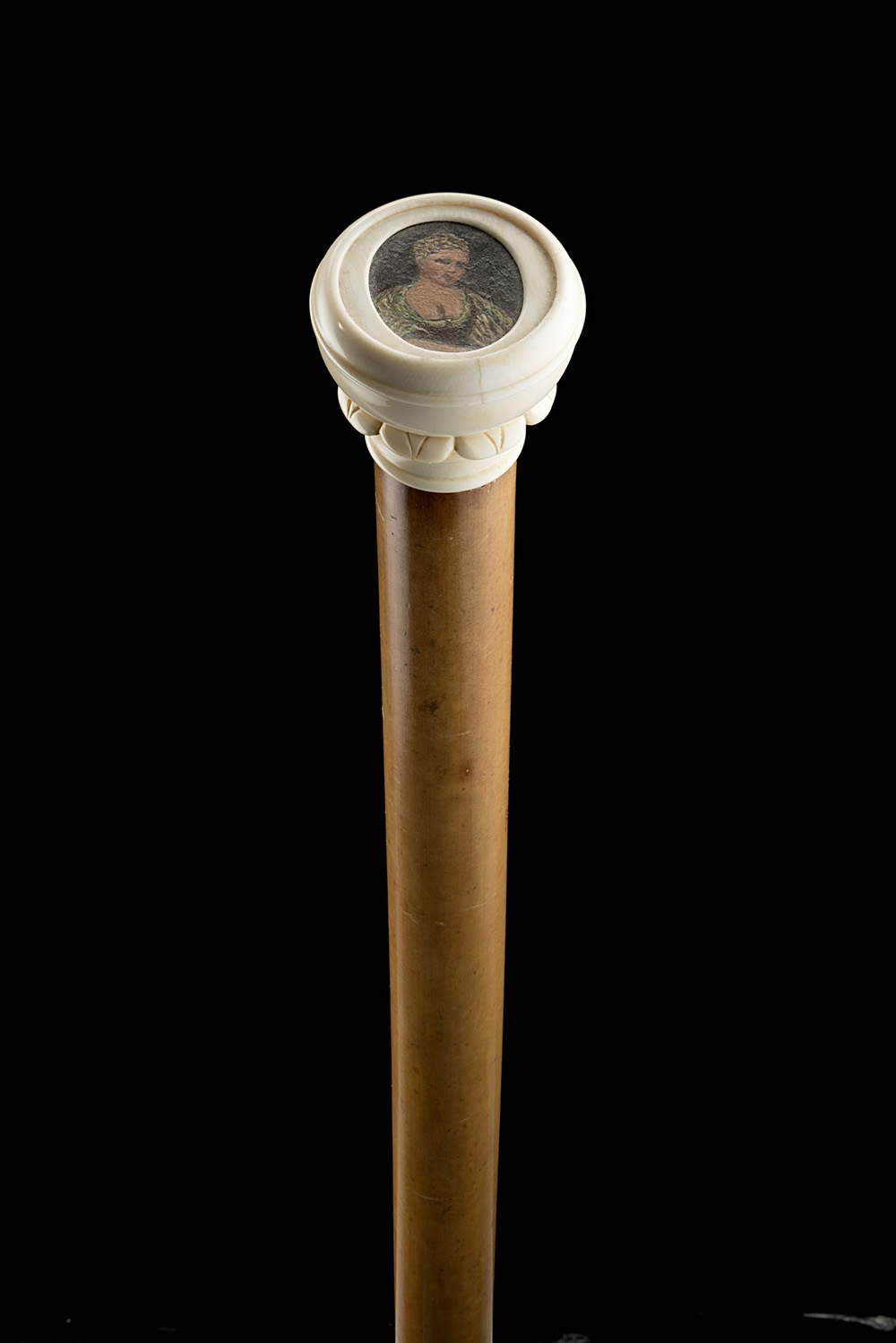 Bastone con canna in legno e presa in avorio con tabacchiera decorata da miniatura su rame raffigurante gentildonna. Sec. XIX A wood walking stick with ivory snuff box handle. 19th century