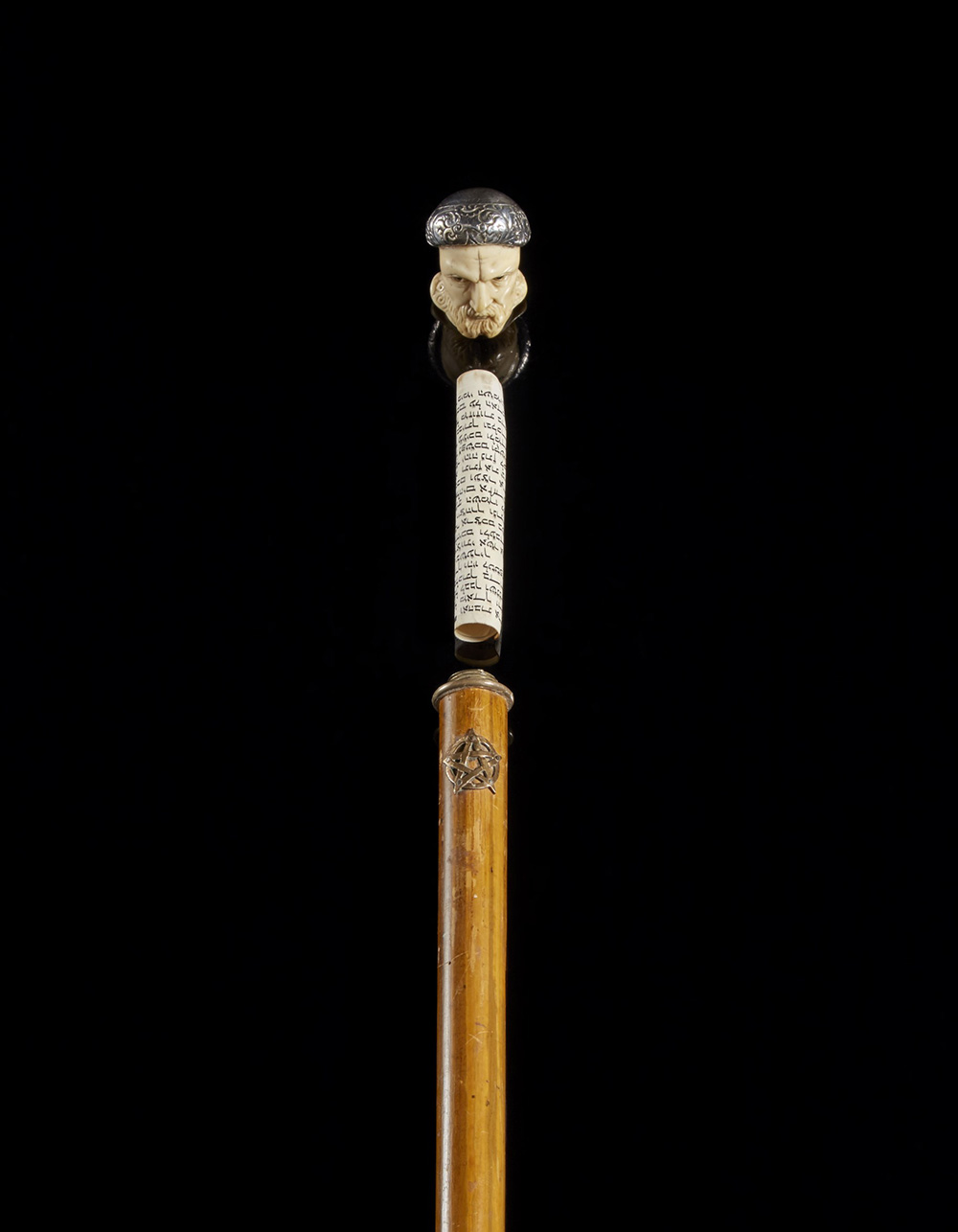 Bastone "Mezuzah" con canna in malacca e impugnatura in avorio scolpito a testa di rabbino con copricapo in argento. Pomolo svitabile celante pergamena iscritta. Fusto decorato con stella di David in metallo dorato. Inizio sec. XIX A Malacca "Mezuzah" walking stick with ivory handle enclosing a parchment paper roll. Early 19th century