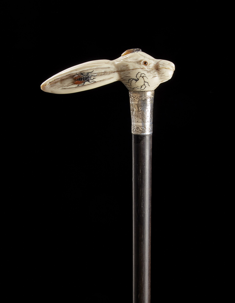 Bastone con presa Shibayama in avorio scolpito a testa di coniglio e decorata con insetti. Giappone, fine sec. XIX A walking stick with Shibayama ivory handle. Japan, late 19th century