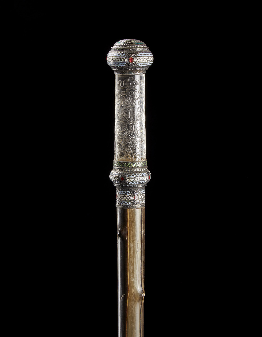 Bastone con canna in corno e impugnatura in cristallo di rocca inciso a volute e trifogli. Ghiere in argento smaltato in policromia e inciso a motivi geometrici. Impero Austro Ungarico, 1866-1922 A horn walking stick with rock crystal handle. Silver ring collar. Austrian-Hungarian empire, 1866-1922