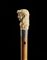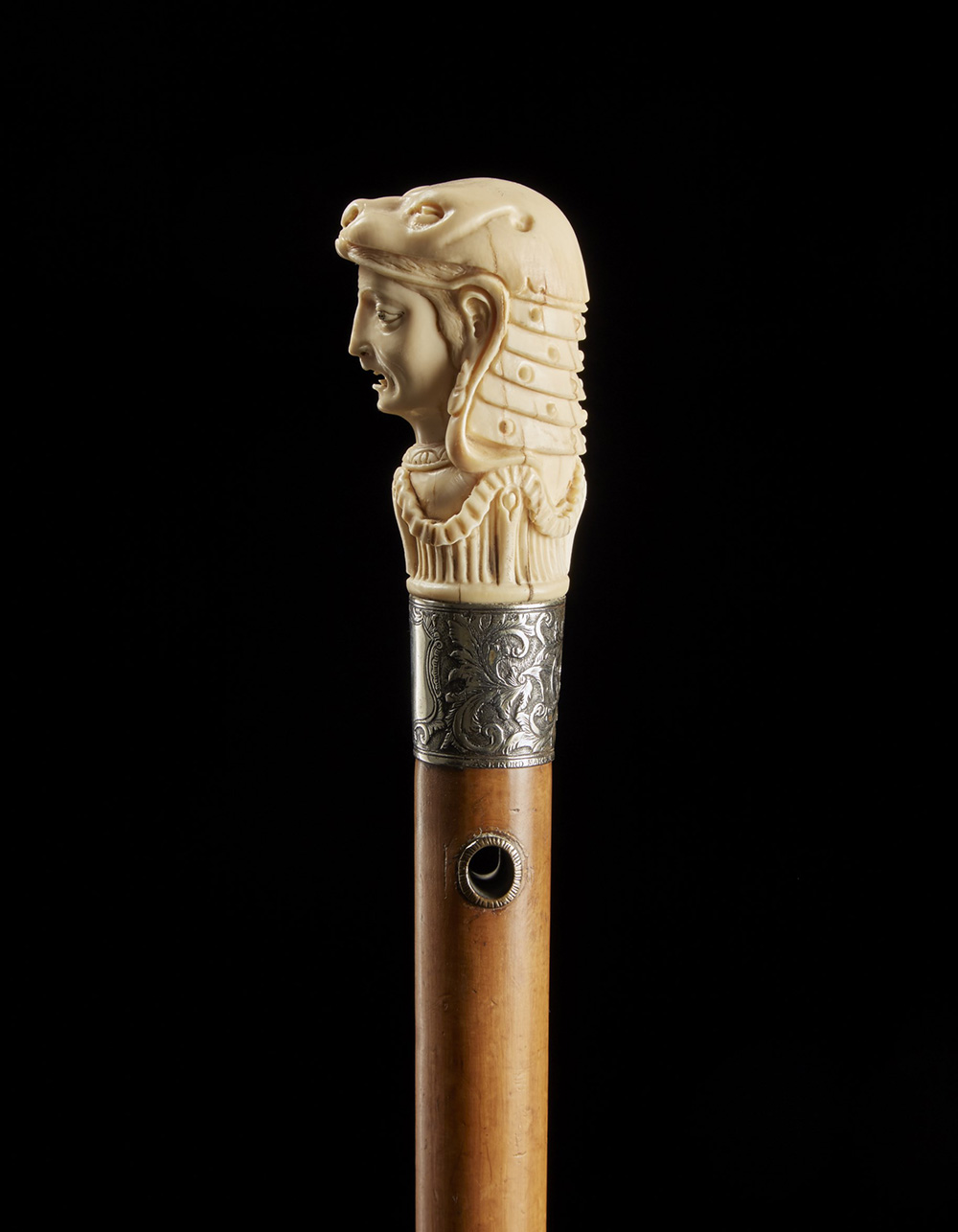 Bastone in legno con foro passante per stringa. Impugnatura in avorio intagliato a mezzo busto di Eracle. Ghiera in argento inciso a volute e cartiglio inscritta "Ashford maker to the Queen" Londra sec. XIX A wood walking stick with ivory handle. Silver collar with engraved "Ashford maker to the Queen". London, 19th century