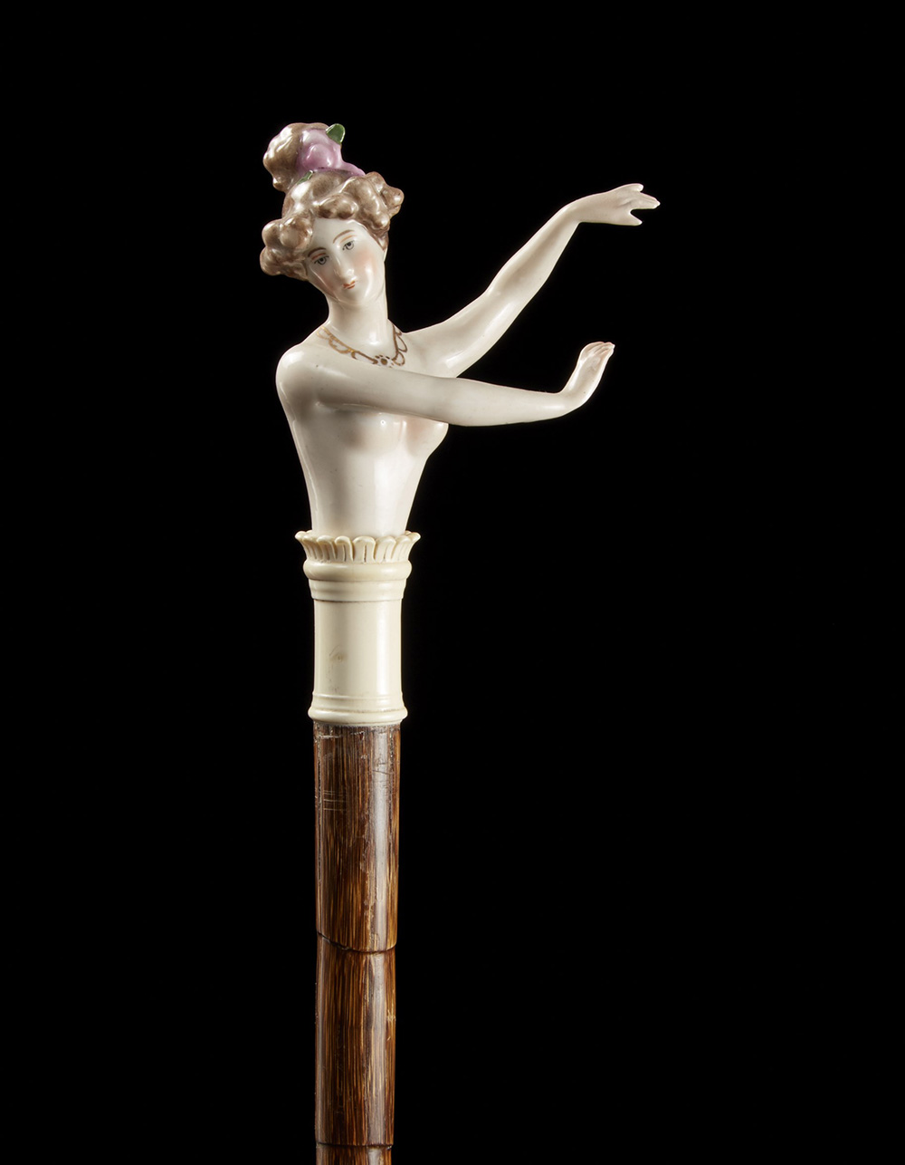 Bastone con canna in bamboo e impugnatura in porcellana a mezzo busto di ballerina decorata in policromia. Ghiera e puntale in avorio. Inizio sec. XX A bamboo walking stick and porcelain handle. Ivory collar and tip. Early 20th century