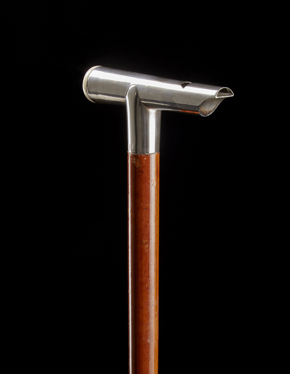 Bastone con canna in legno e presa a fischietto in argento con applicazione...