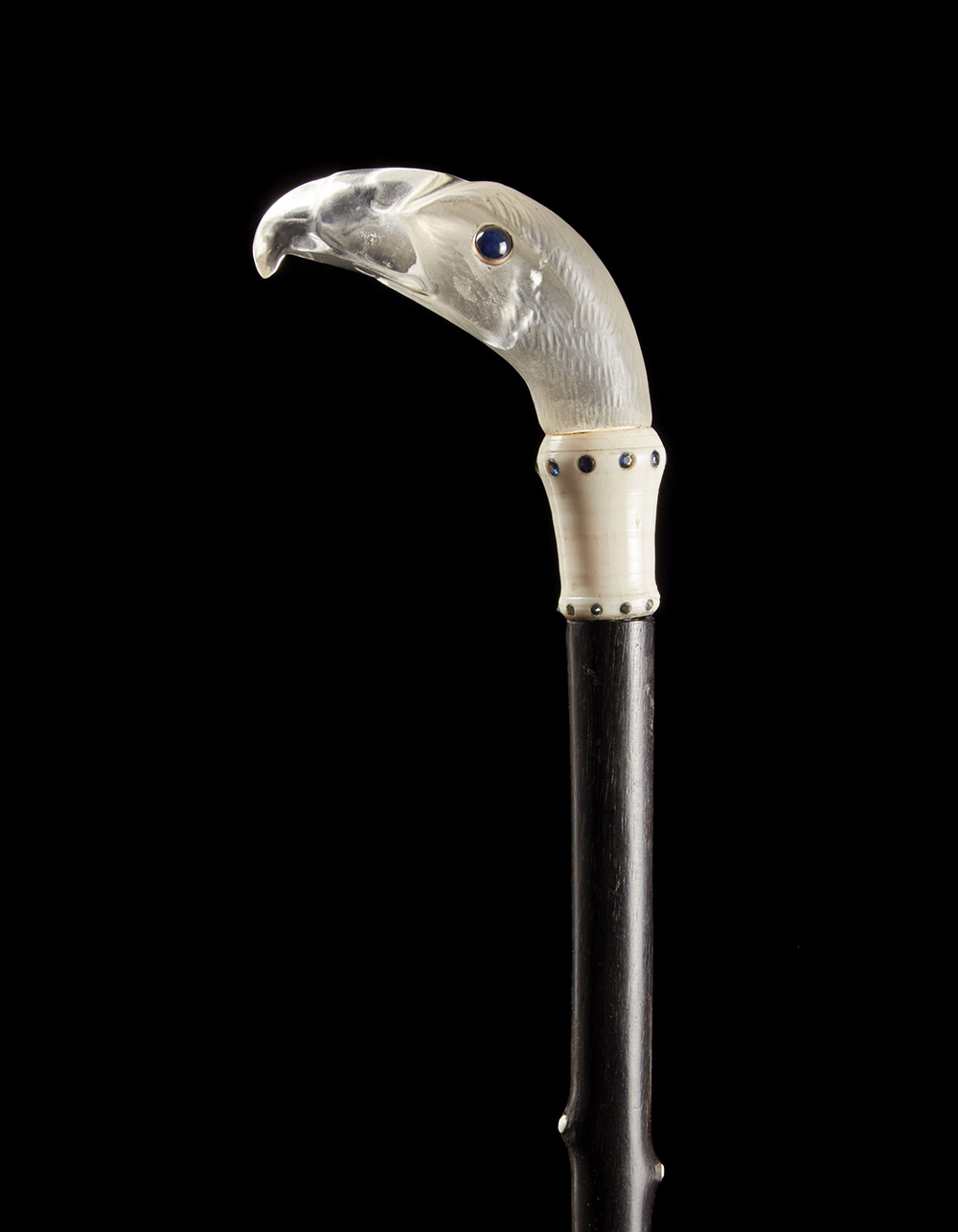 Bastone in ebano con nodi decorati da cabochon in avorio. Impugnatura in cristallo di rocca a guisa di aquila, occhi e ghiera incastonati da zaffiri. Fine sec. XIX (lievi difetti) An ebony walking stick with ivory cabochon. Rock crystal handle with sapphires. Late 19th century (minor defects)